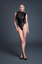 Unleash your inner femme fatale with our Latex-Look Vinyl & Mesh Deep V Bodysuit! This daring piece will hug your curves in all the right places and make you feel like a bold and fearless warrior. Let the mesh panels and deep V neckline show off your wild side and ignite some serious passion! Make a statement and take on the world with confidence in this seductive and empowering bodysuit.