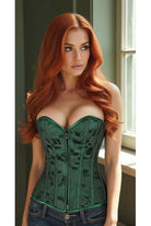 - Push your fashion boundaries with this daring Daisy Dark Green Lace Overbust Corset! Its premium materials include high-quality satin and lace net overlay, while its design boasts a hidden zipper closure and strong plastic and steel bones. With nickel brass grommets and cinching cords, this corset provides a secure fit and stunning silhouette. Plus, garter loops bring a seductive edge to your look. Dry clean only to preserve its impeccable quality. Embrace your daring side and elevate your wardrobe with this bold corset!
