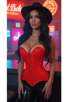 - Elevate your allure with the Daisy Corset Red Brocade Overbust Corset, crafted from luxurious premium brocade fabric that commands attention. Featuring a sturdy front busk closure and reinforced with 10 plastic bones plus 4 static steel back bones, it offers both structure and comfort for a striking silhouette. The nickel brass grommets paired with thick back lacing allow for precise cinching, enhancing your curves with confidence. A privacy panel ensures smooth wear, while garter loops add versatility for pairing with stockings. Perfect for daring statement looks, this corset requires dry cleaning to maintain its rich texture and vibrant color.