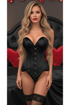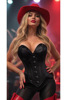 - Elevate your silhouette with the Daisy Black Satin Steel Boned Overbust Corset, crafted from luxurious satin that gleams with every movement. Its daring deep V sweetheart neckline accentuates your décolletage, while the steel boning and waist tape sculpt your curves into an irresistible hourglass shape. The front busk closure offers secure support, complemented by a lace-up back that lets you cinch your waist to perfection. Designed for both style and structure, this corset demands attention and confidence. Care for it with dry cleaning or gentle hand washing to maintain its sleek finish and lasting allure.