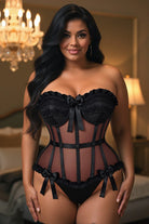 - Elevate your allure with the Daisy Steel Boned Black Mesh Underwire Bustier Corset, crafted from premium mesh fabric that contours your silhouette with daring elegance. Featuring underwire padded cups for enhanced lift and support, this corset is detailed with delicate ruffle and bow trims that add a touch of playful seduction. The side zipper closure ensures a sleek fit, while the waist tape and fully steel boned structure provide firm shaping and posture support. Complete with a lace-up back, it allows you to cinch your waist to perfection, making it the ultimate statement piece for confident, bold style.