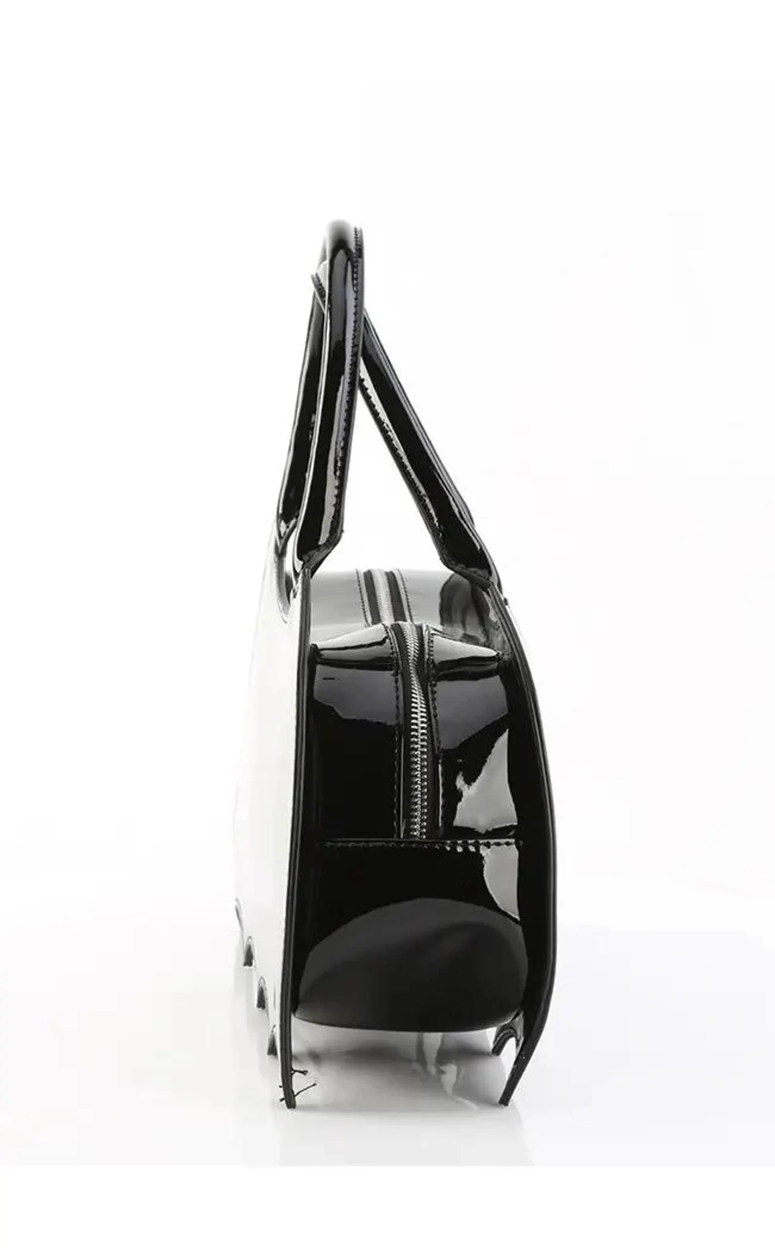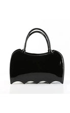 This sweet 'n petite black patent handbag is our new favorite evening out & special occasion bag! This 'lil bag drips with gothic elegance with its subtle bat shape and wing scalloping detail - perfect to be accessorized with a pair of black patent heels and your favorite little black dress.