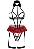 Earn your grade with this deliciously naughty 2 PC bondage harness teddy set by Leg Avenue. Made from vegan leather, the O-ring studded crotchless lingerie teddy features adjustable straps for the perfect fit and a rip-away plaid skirt. Wear with the school girl skirt for sexy role play fun or without for a hot lingerie look. Pasties and panty not included.