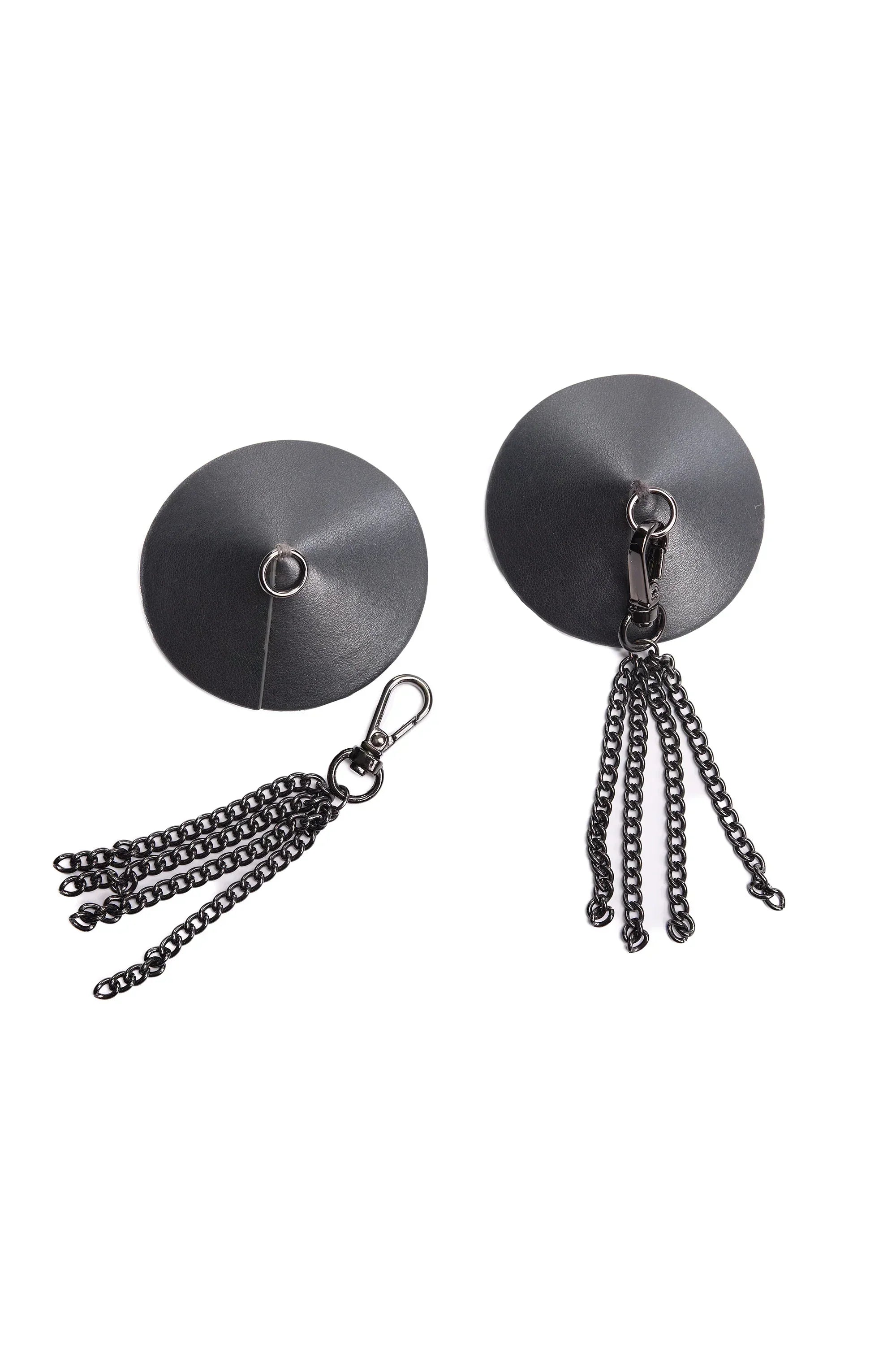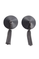 Embody a glamorous, bold, and daring look with our Gunmetal Glam Pasties featuring removable chain tassels for a versatile style. The 3" metal chain length adds edge to the round shaped design, while the reusable self-adhesive backing ensures a secure fit. With a diameter of 2".