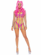 Everything is coming up rainbows in this fun and colorful lingerie dress by Leg Avenue, featuring rainbow fishnet with overlock stitching and long sleeves. Looks amazing paired with festival outfits or as a swimsuit cover up. (Layered items shown not included)