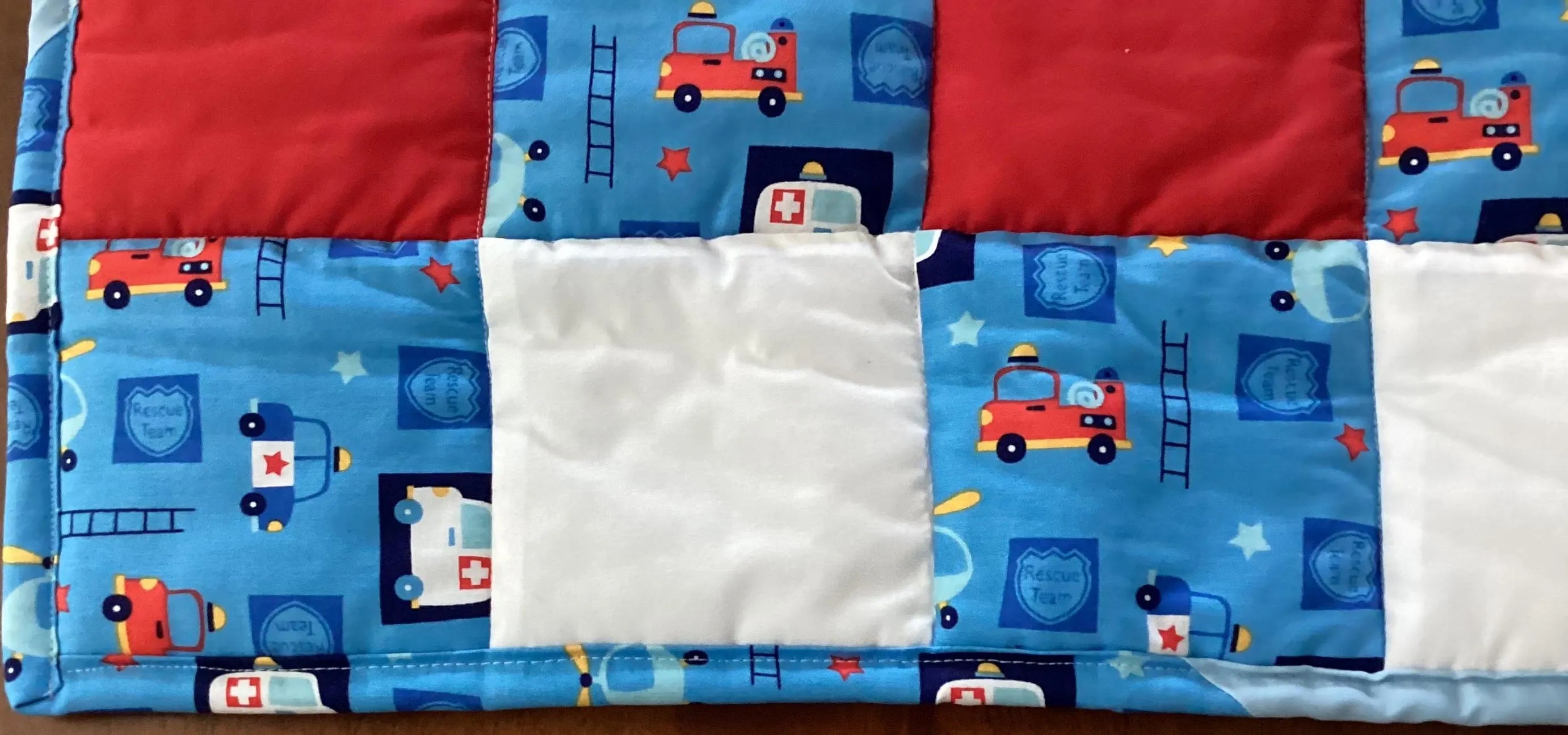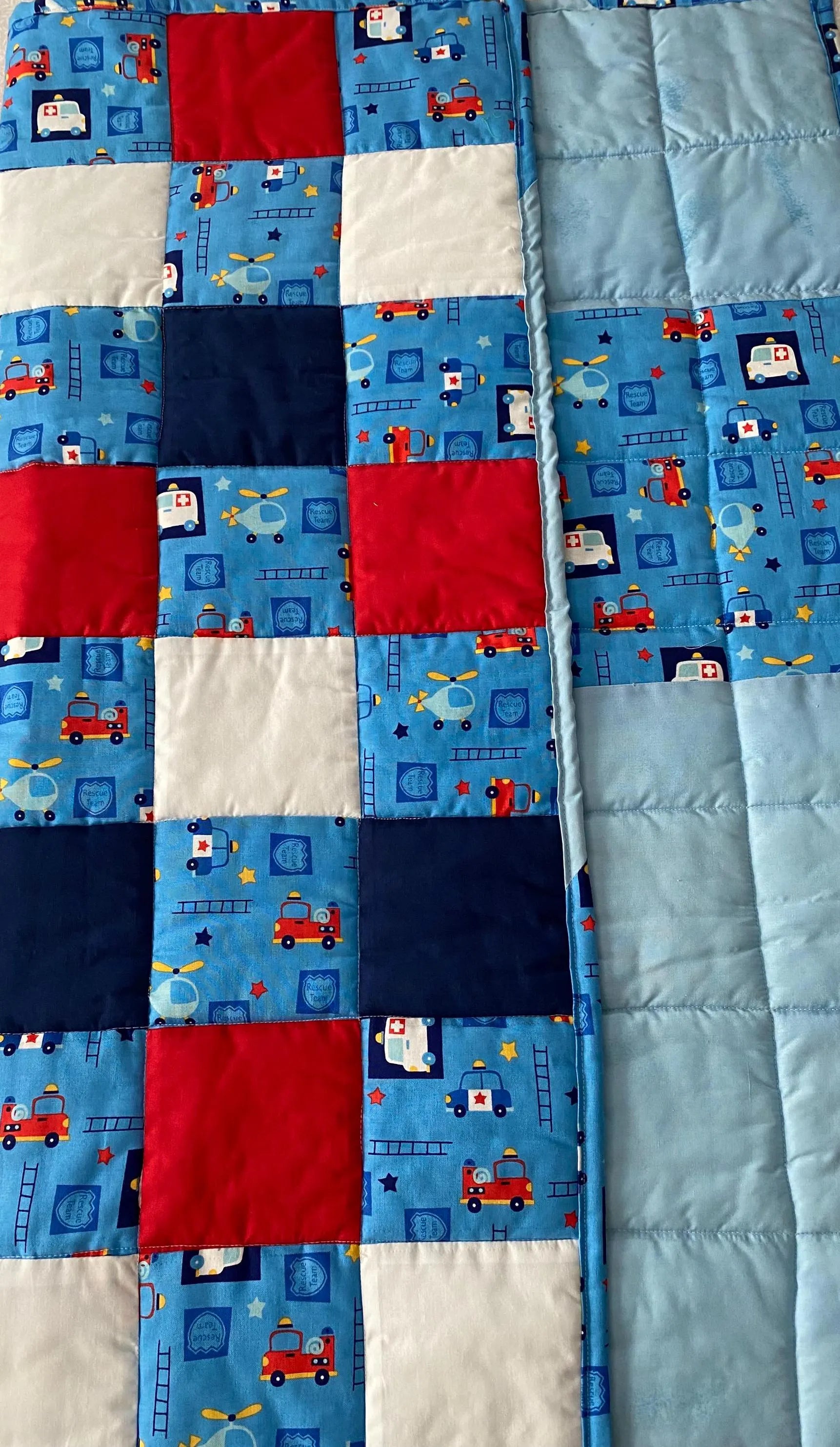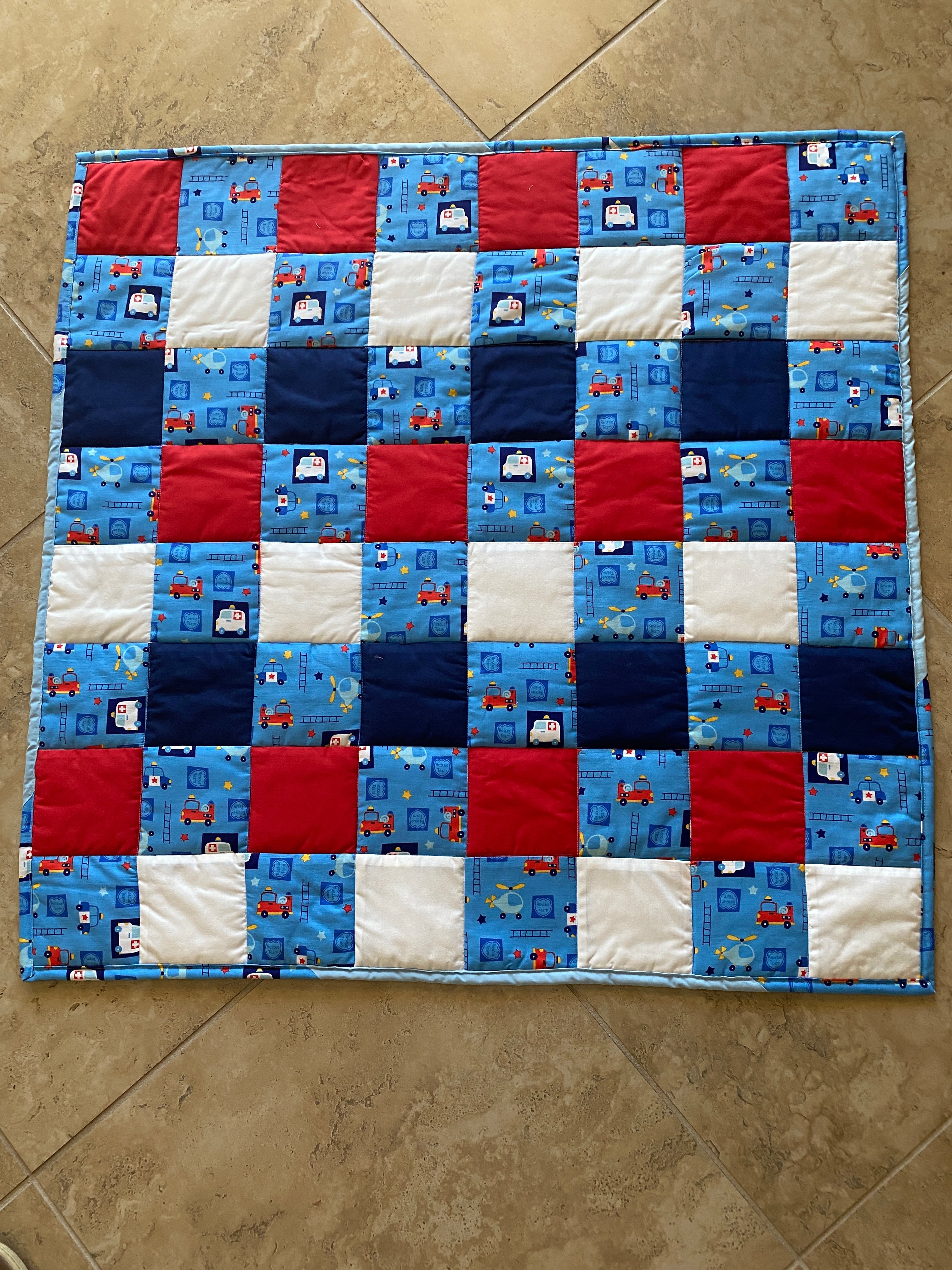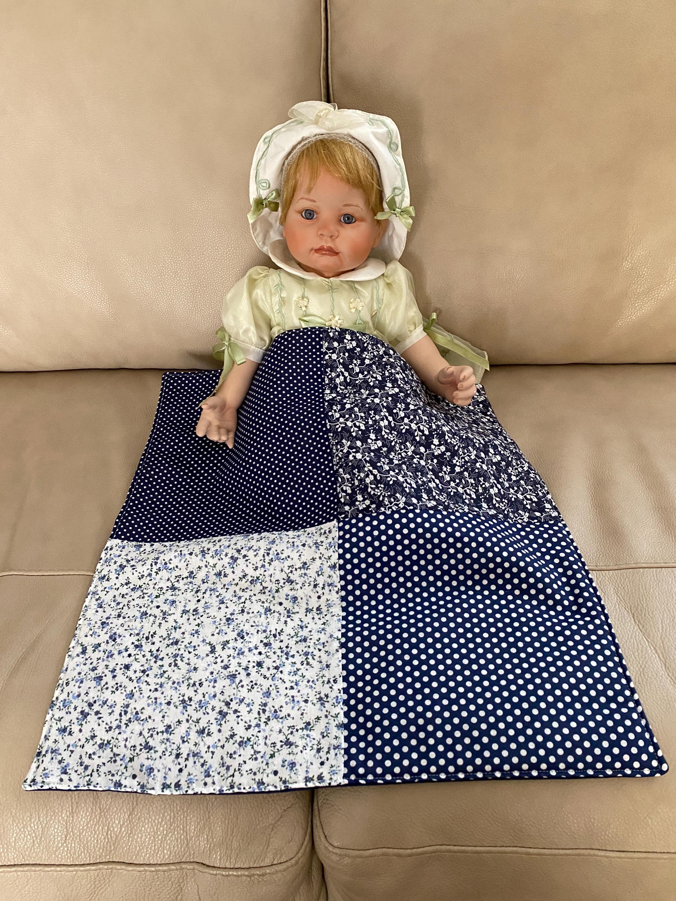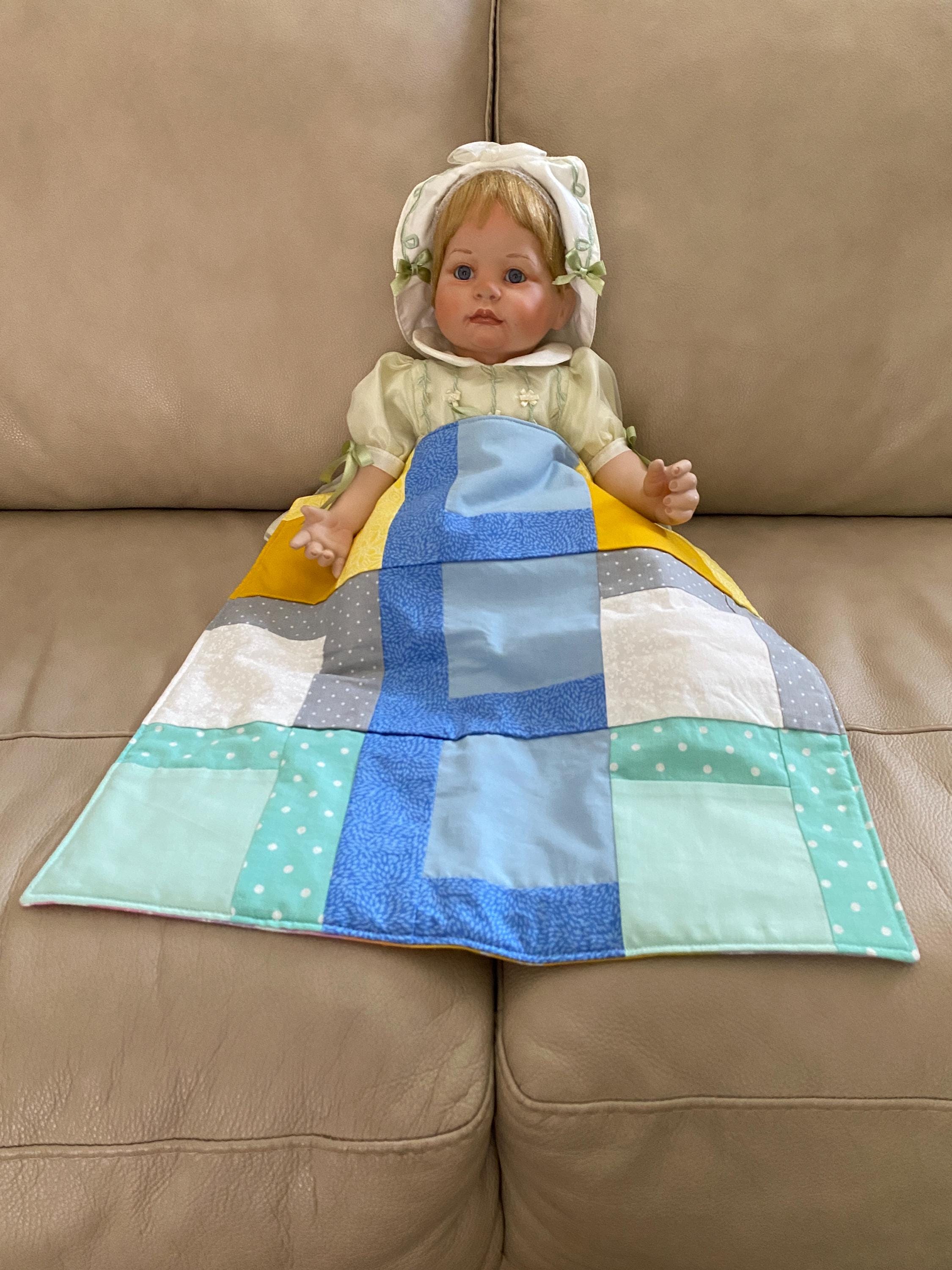 Handmade Baby Doll Quilted Blanket with Colorful Blocks and Blue Rows