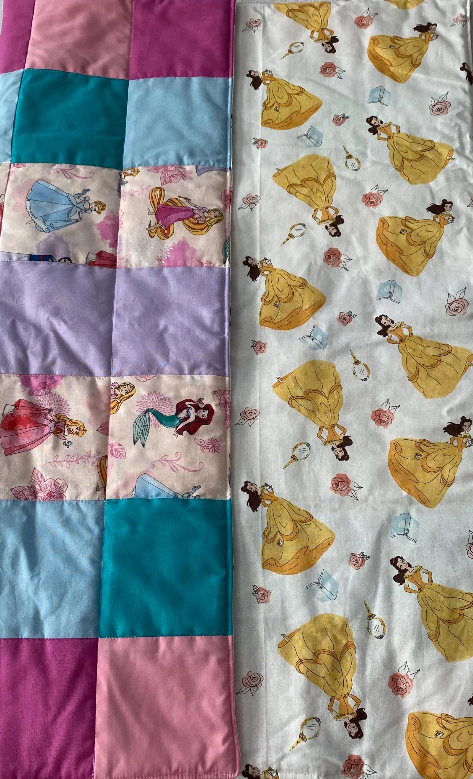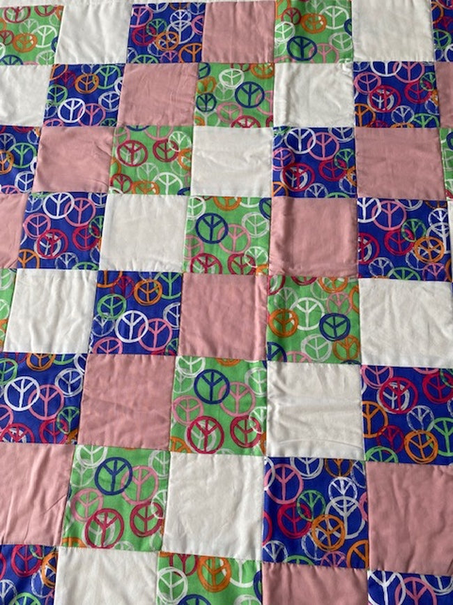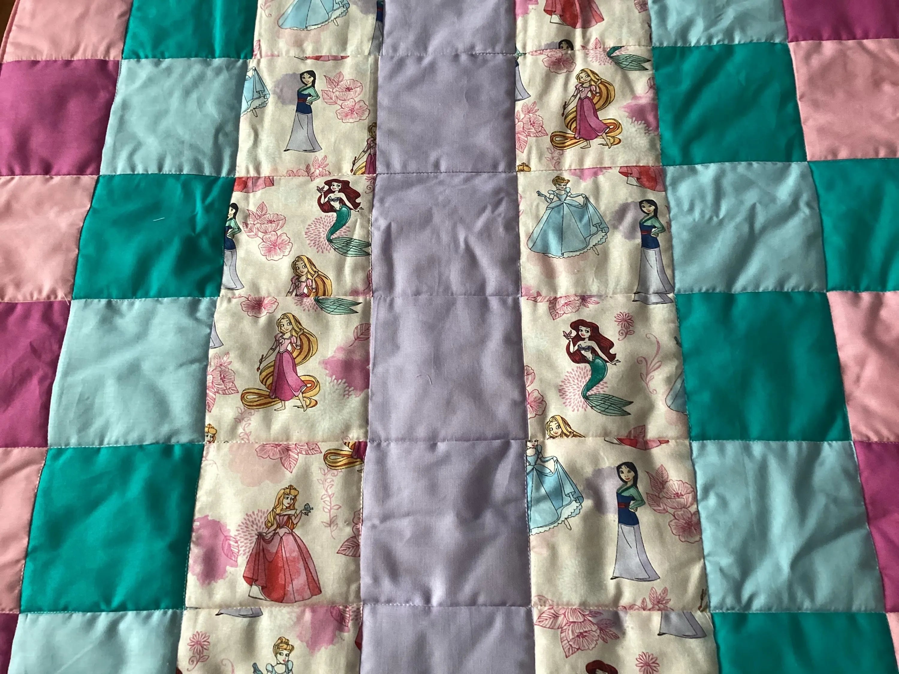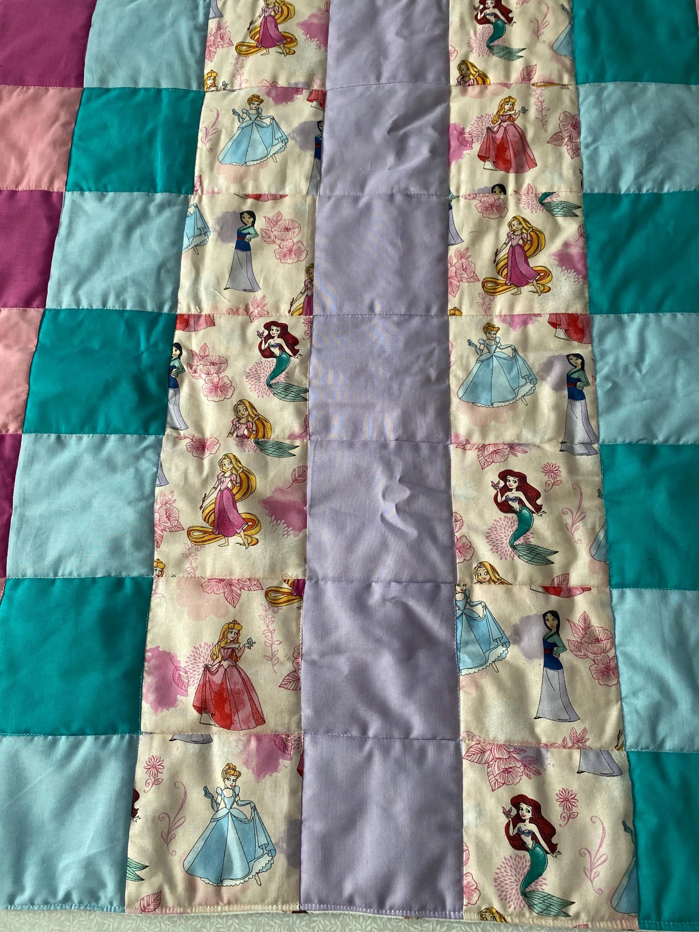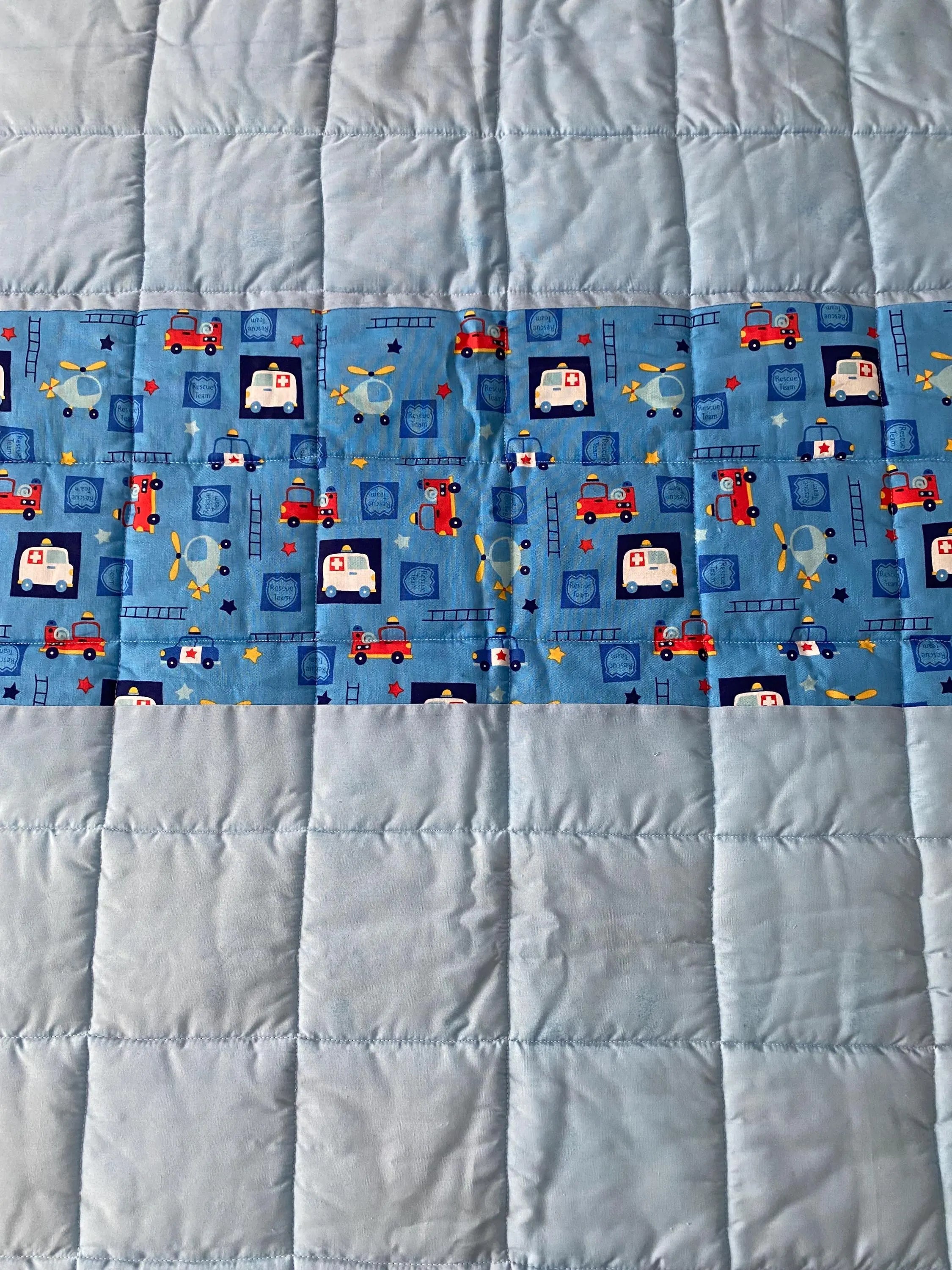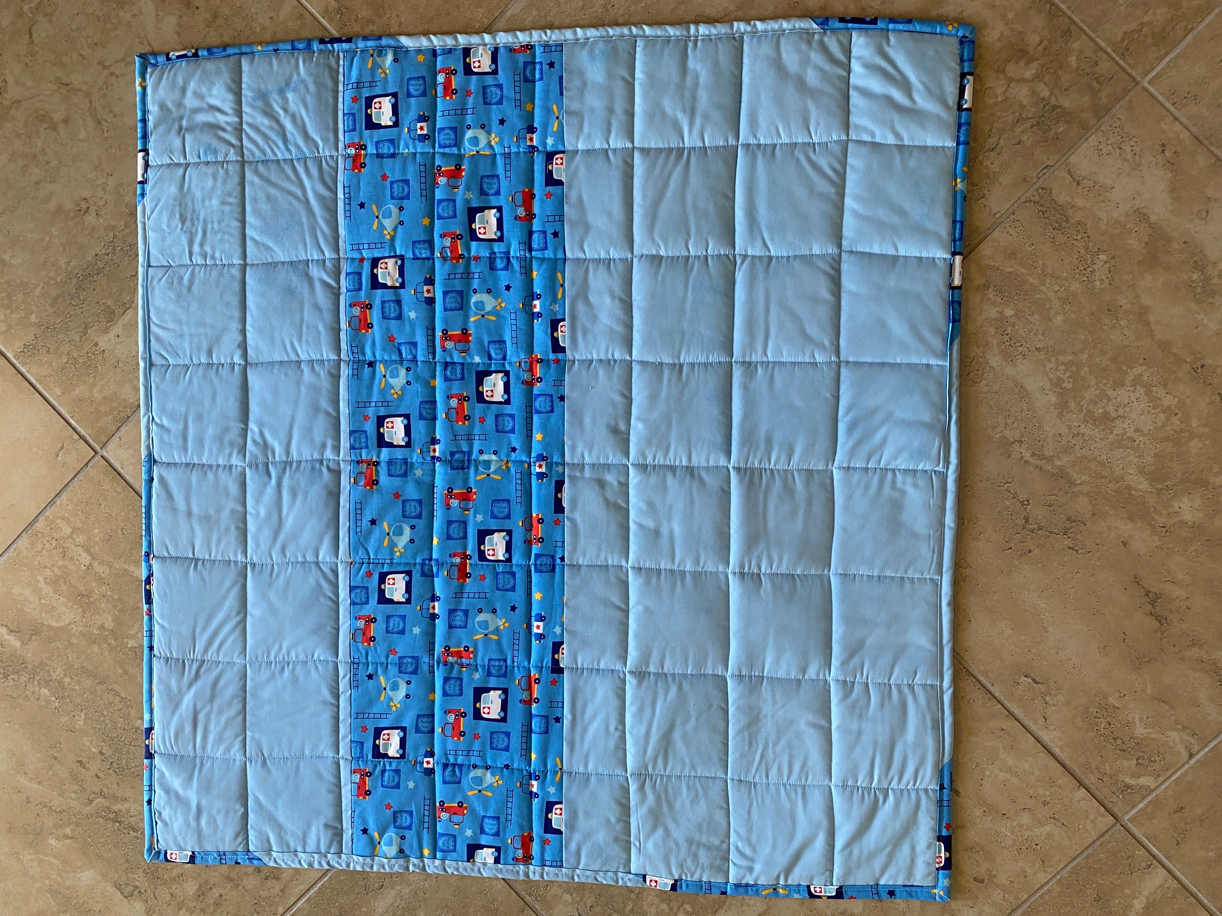 Handmade Baby Doll Quilted Blanket with Colorful Blocks and Blue Rows