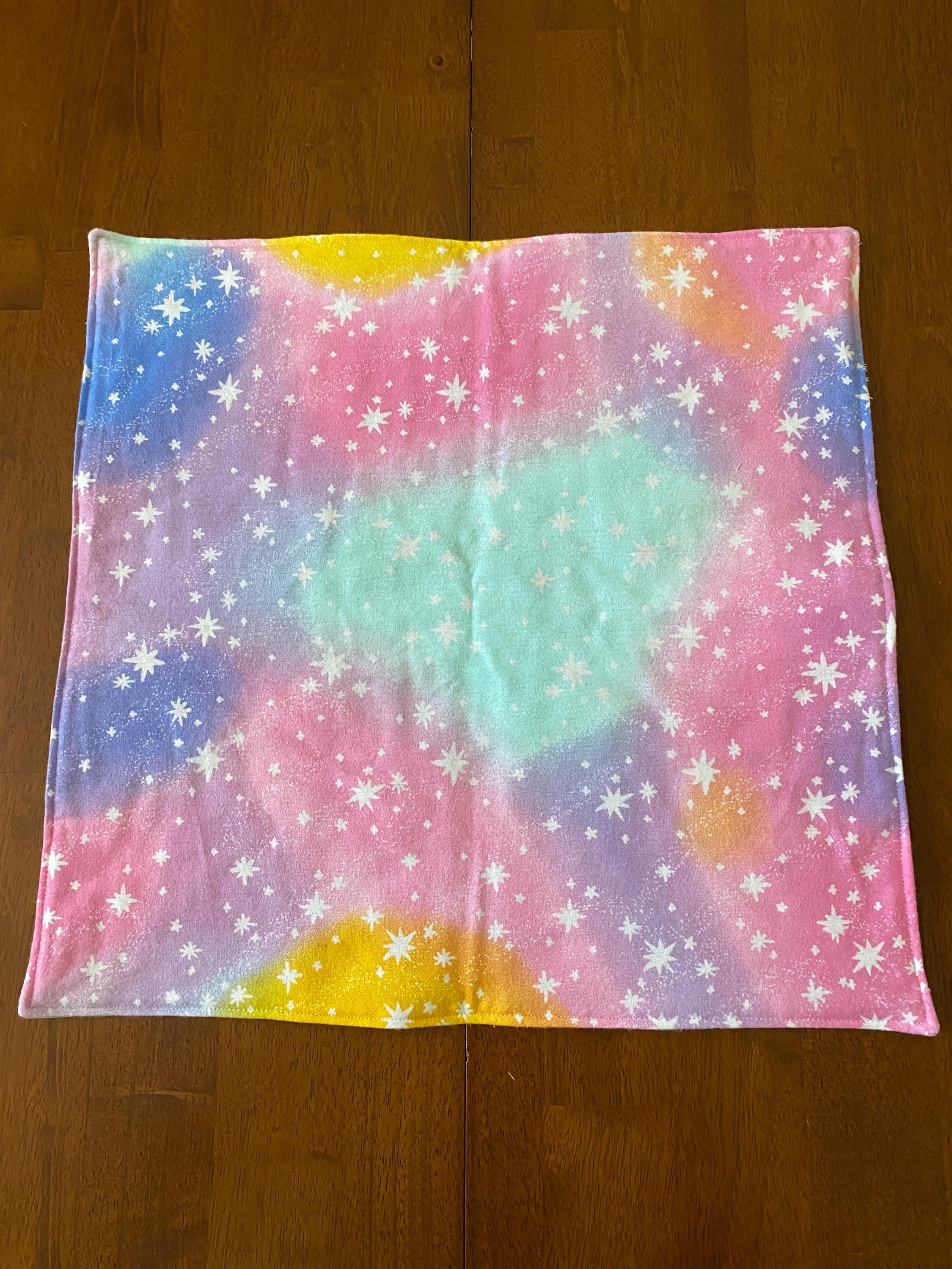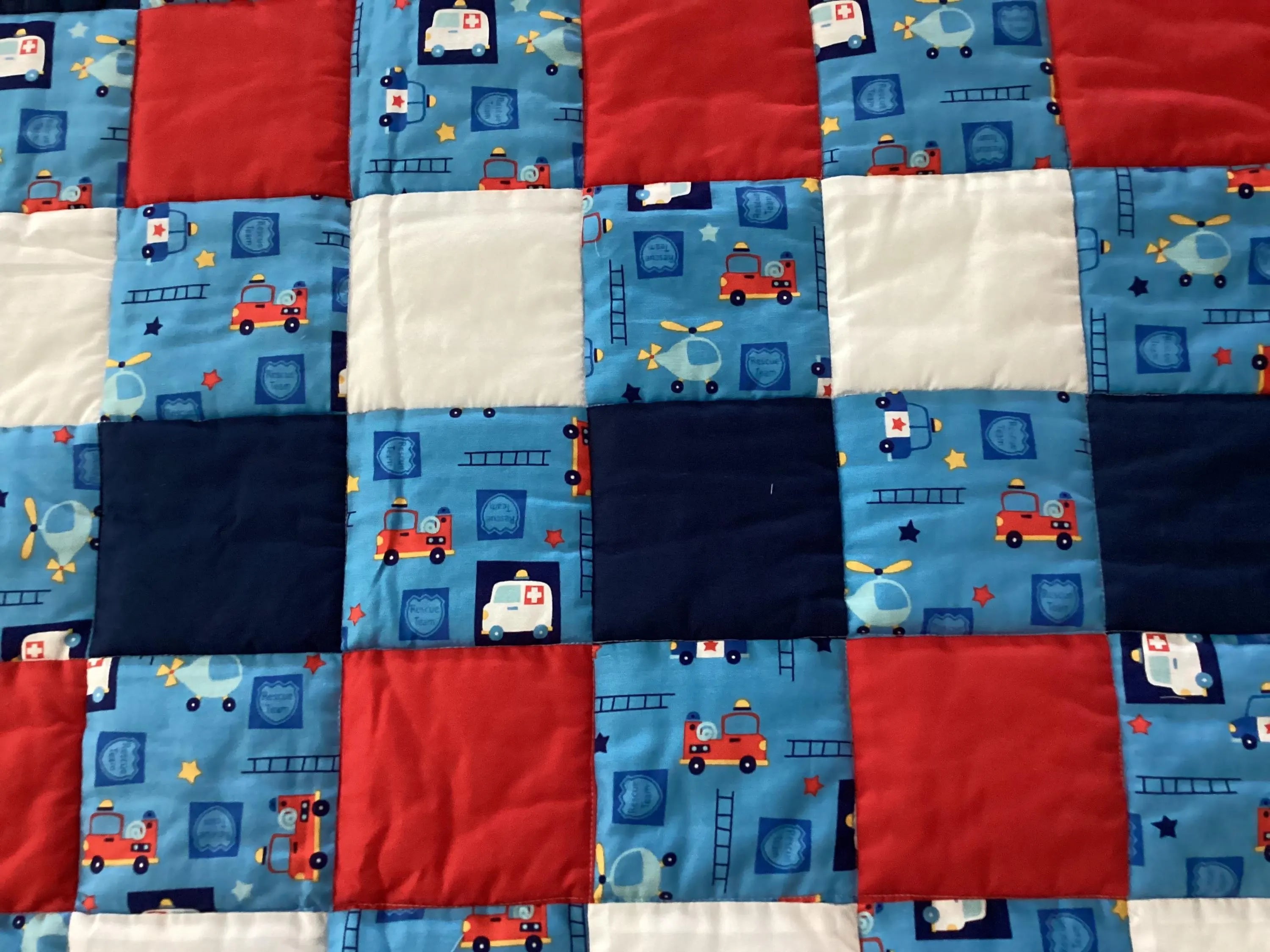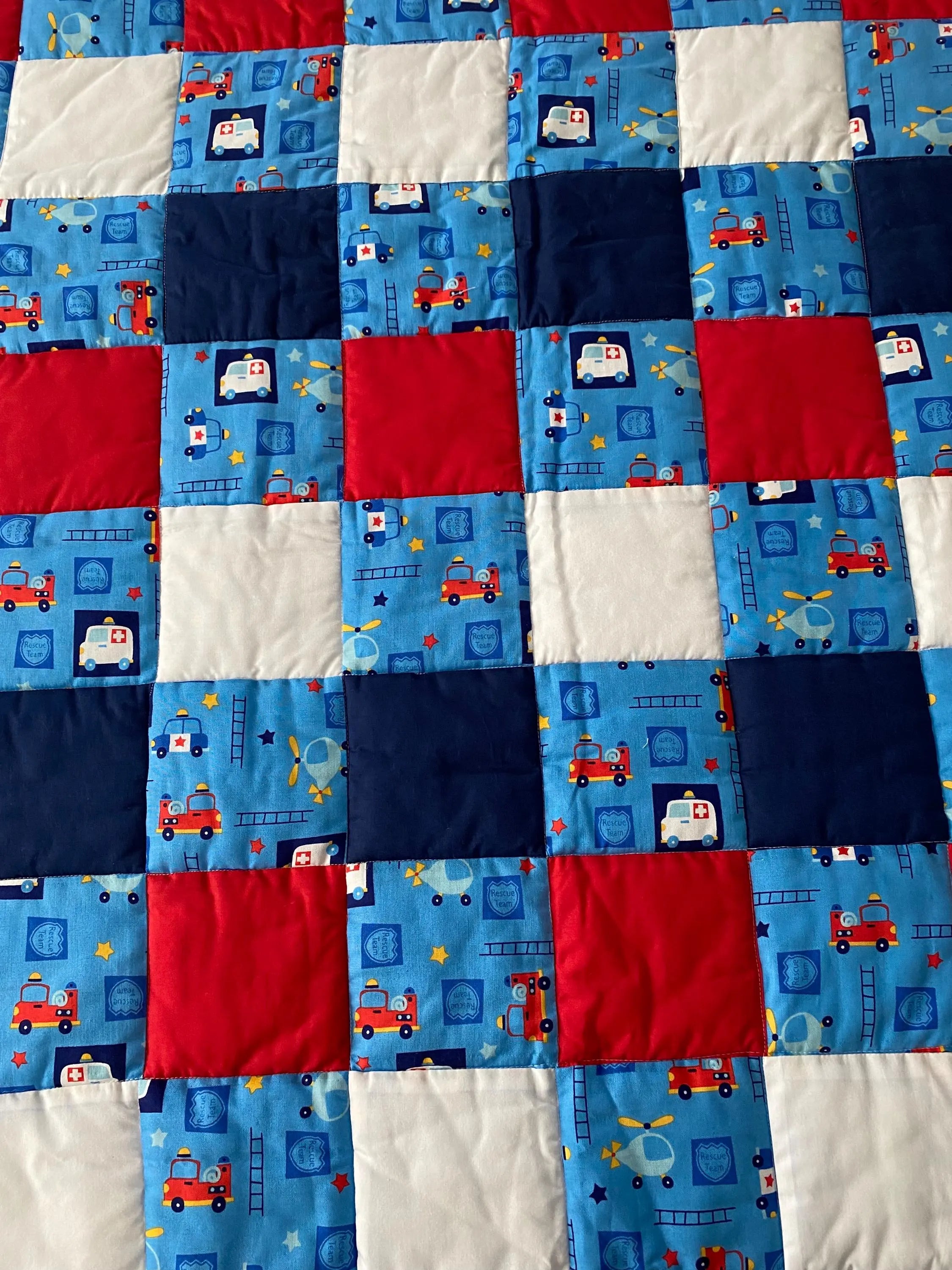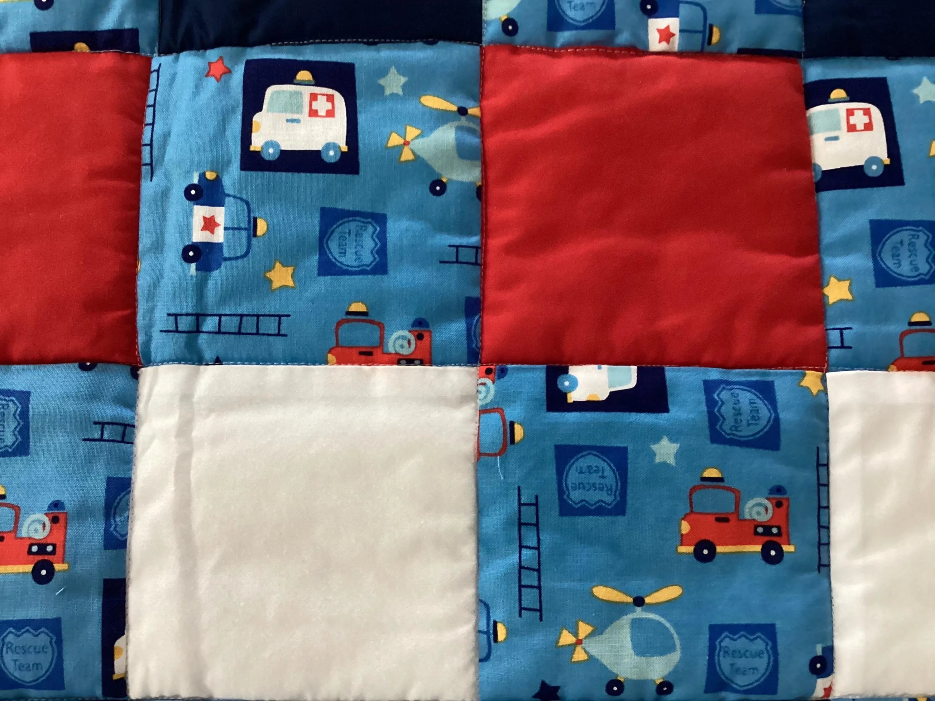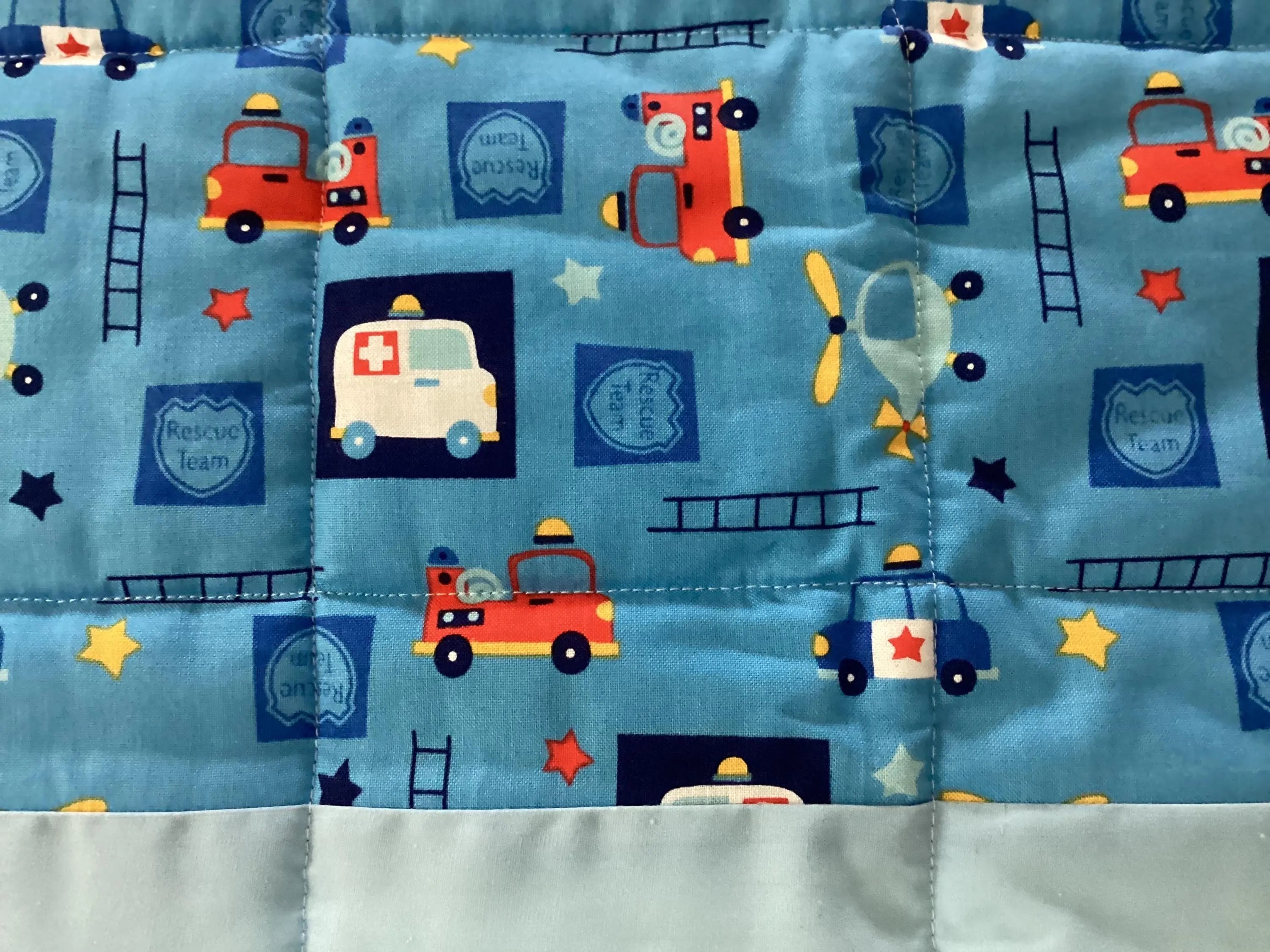 Handmade Baby Doll Quilted Blanket with Colorful Blocks and Blue Rows