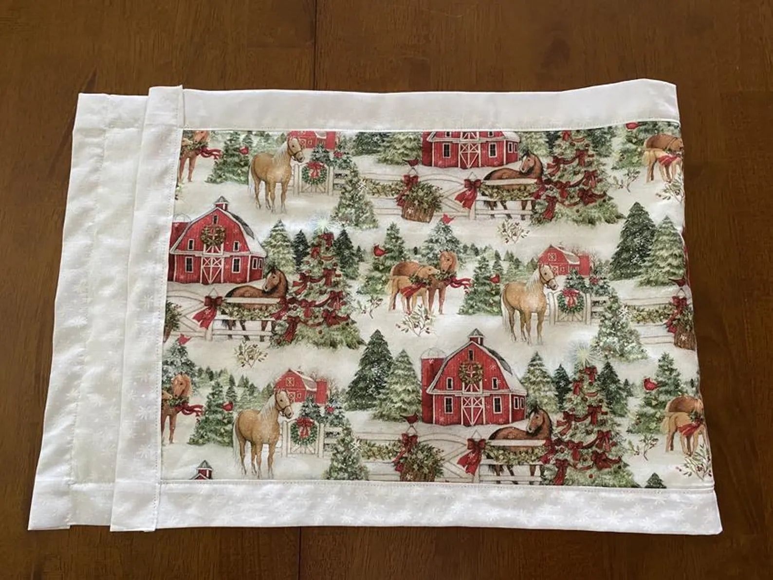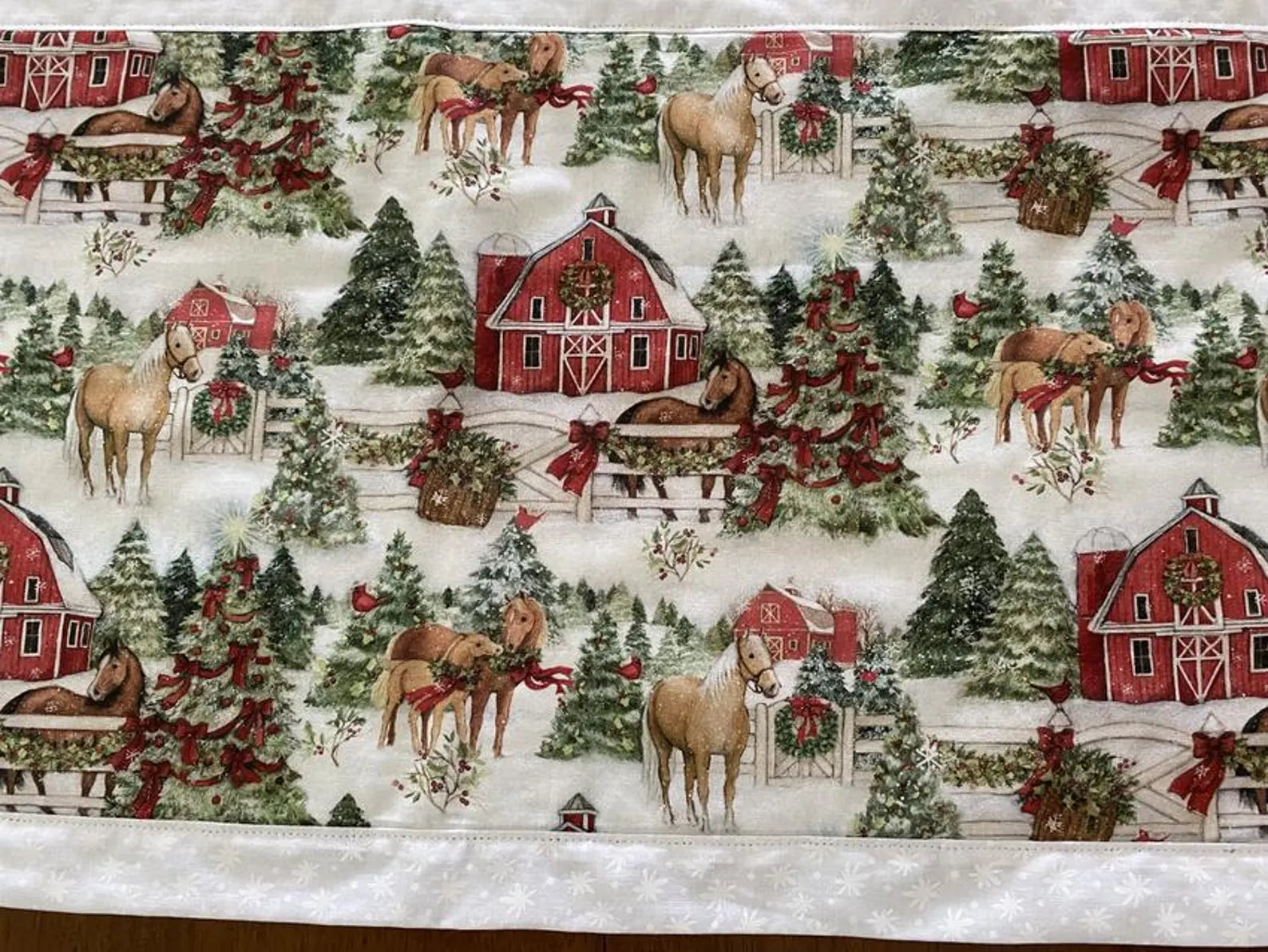 Handmade XMAS Holiday Table Runner Horses and Red Barn