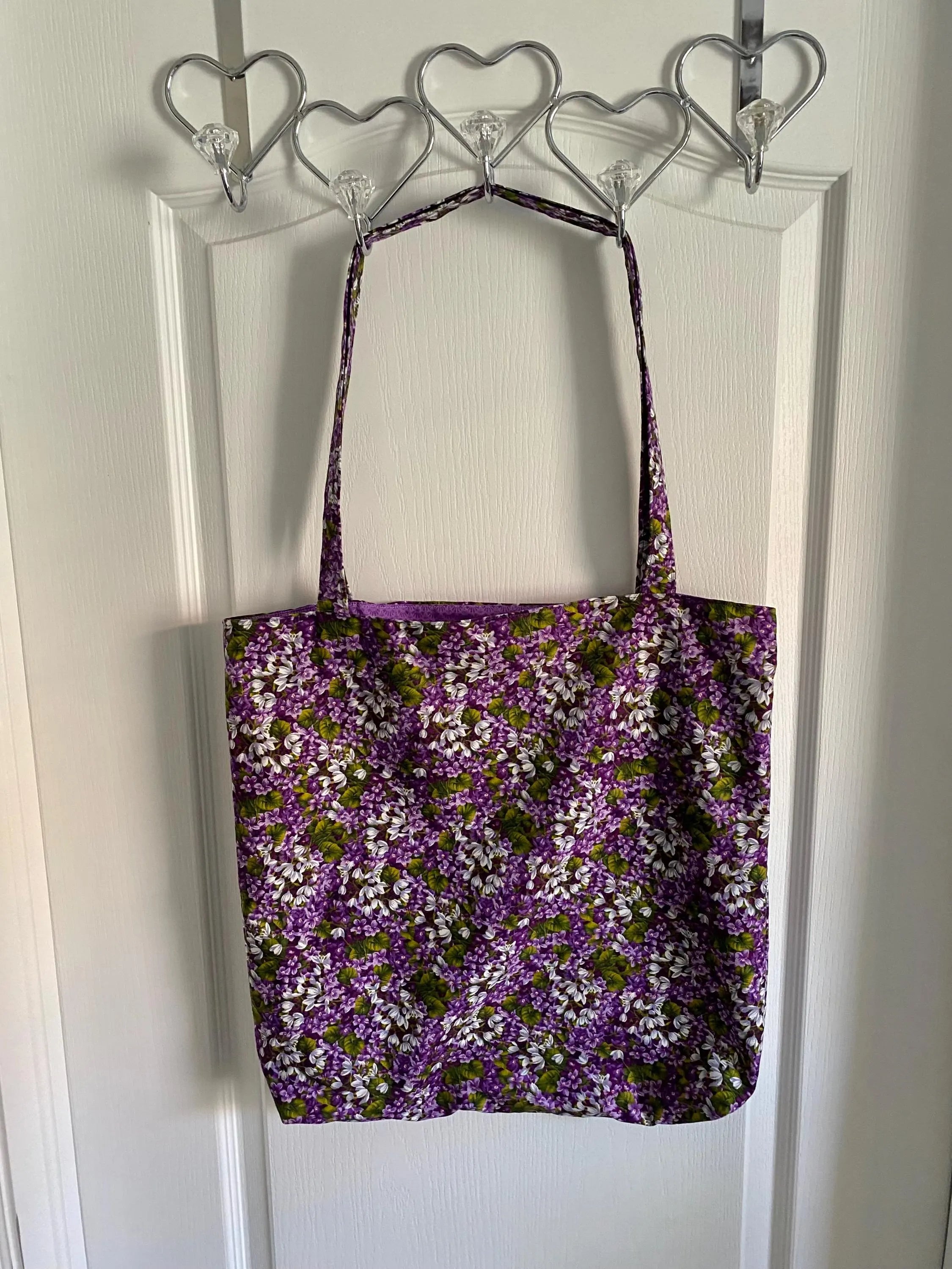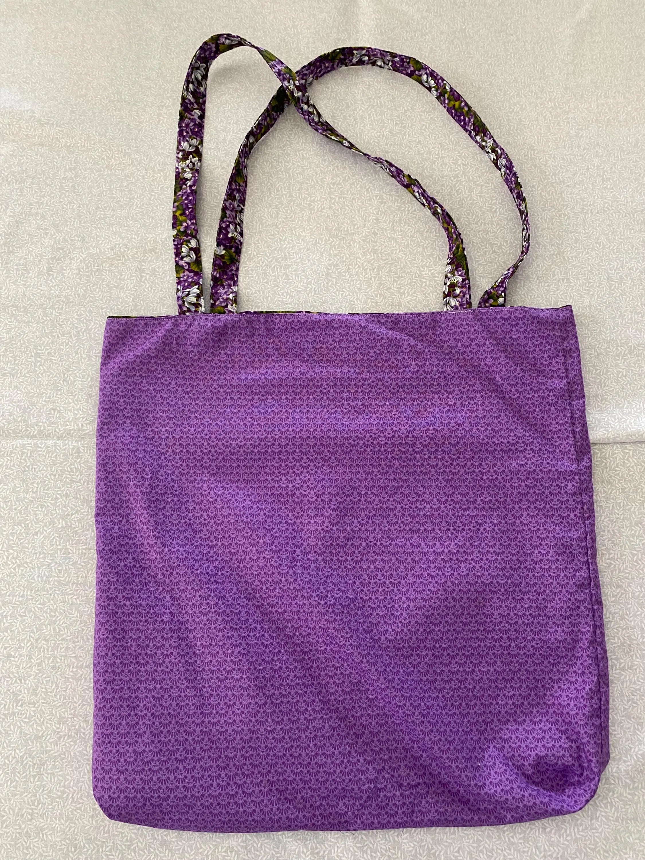 Handmade Reversible Lined Large Size Tote Bag with Purple and White Flowers