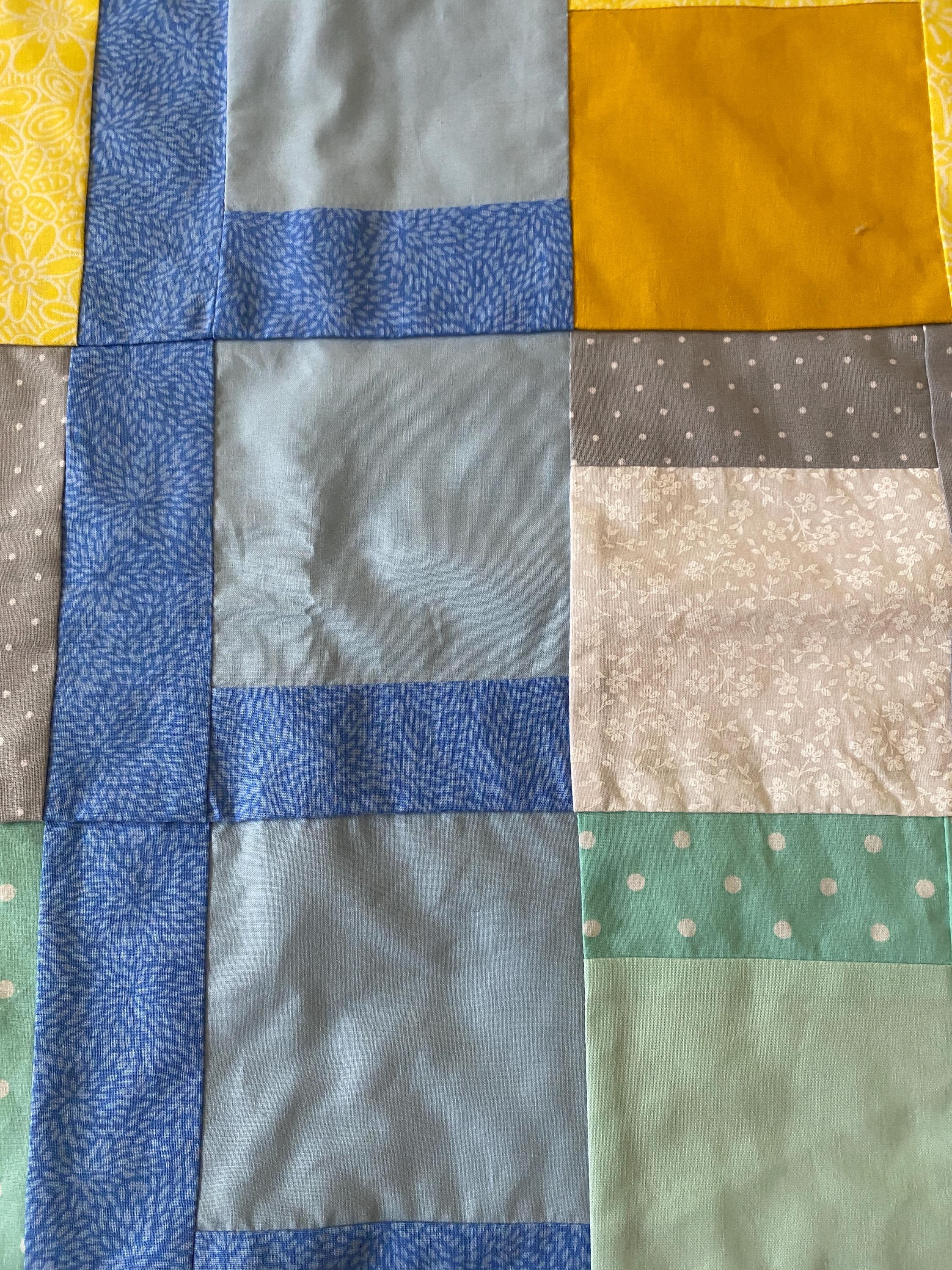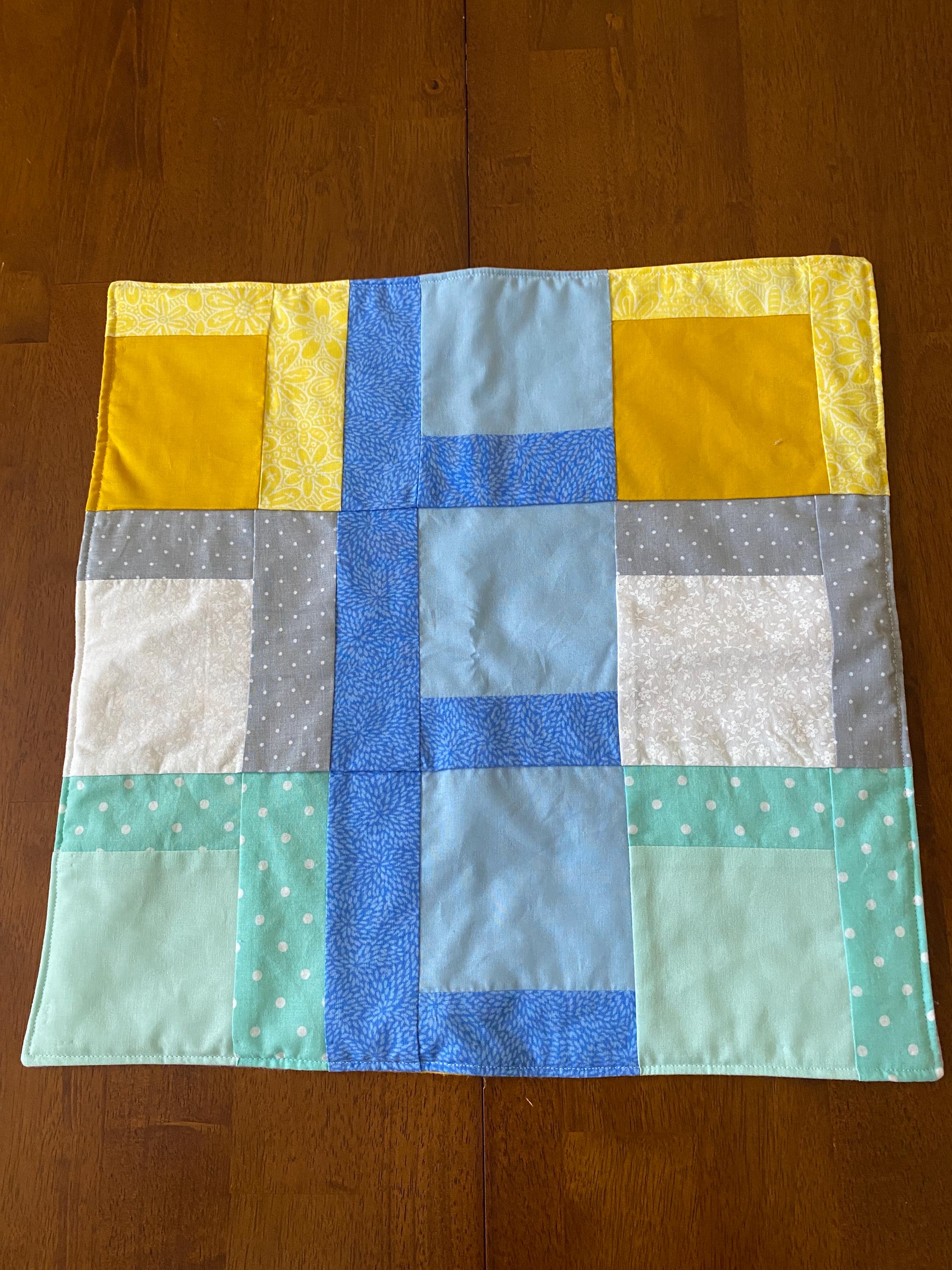 Handmade Baby Doll Quilted Blanket with Colorful Blocks and Blue Rows