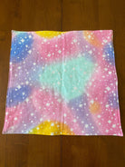 This cute approximate 16”x 16” Handmade Baby Doll Quilted Blanket with Colorful Blocks and Blue Rows. Back is colorful blotches and white stars flannel material. A great young child's birthday gift. Warm Company batting, then quilted the three layers. Perfect for your child's play doll to snuggle with or playtime on the floor. Use, & Wash over & over! They get softer with every wash!