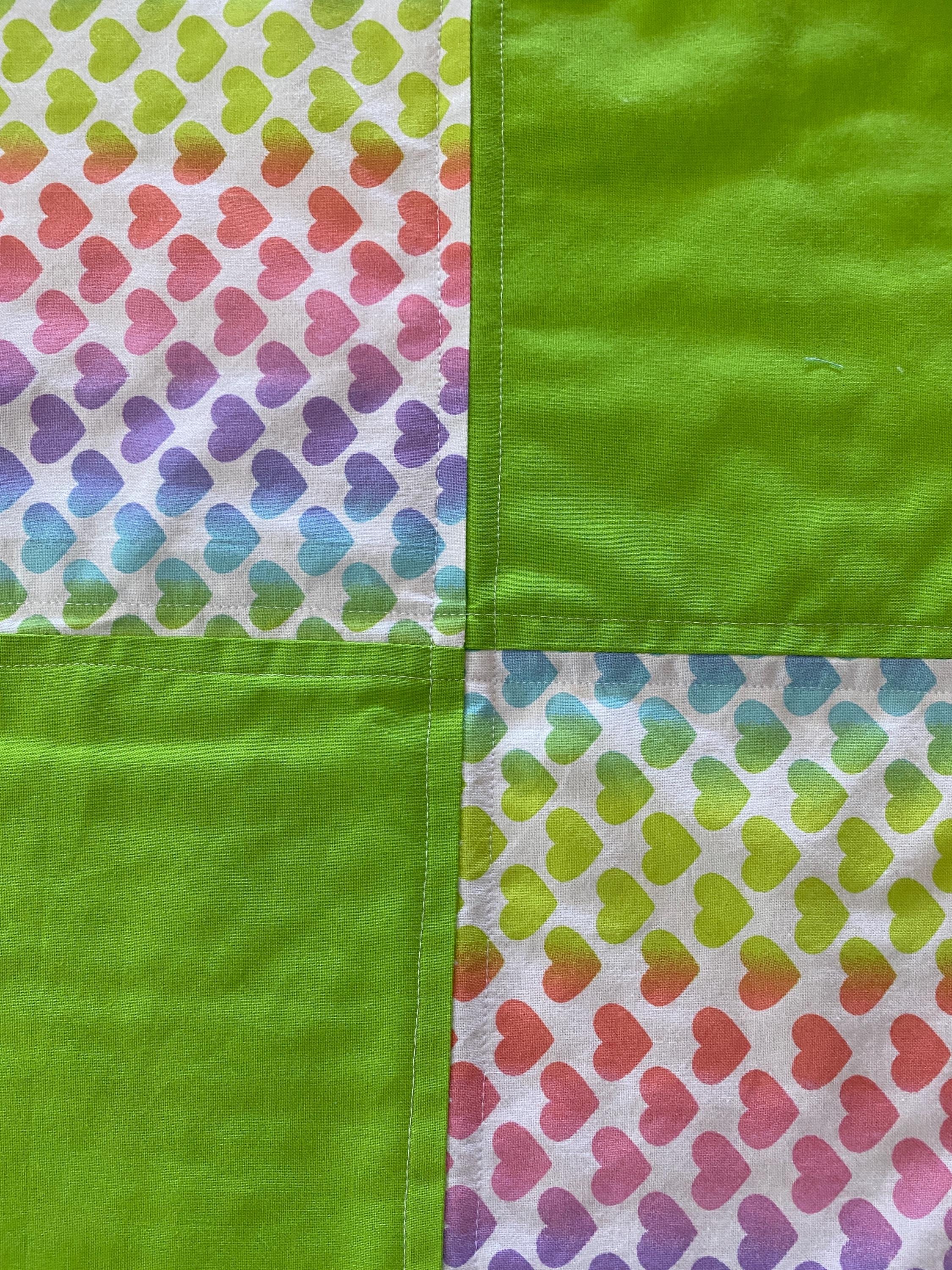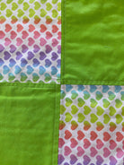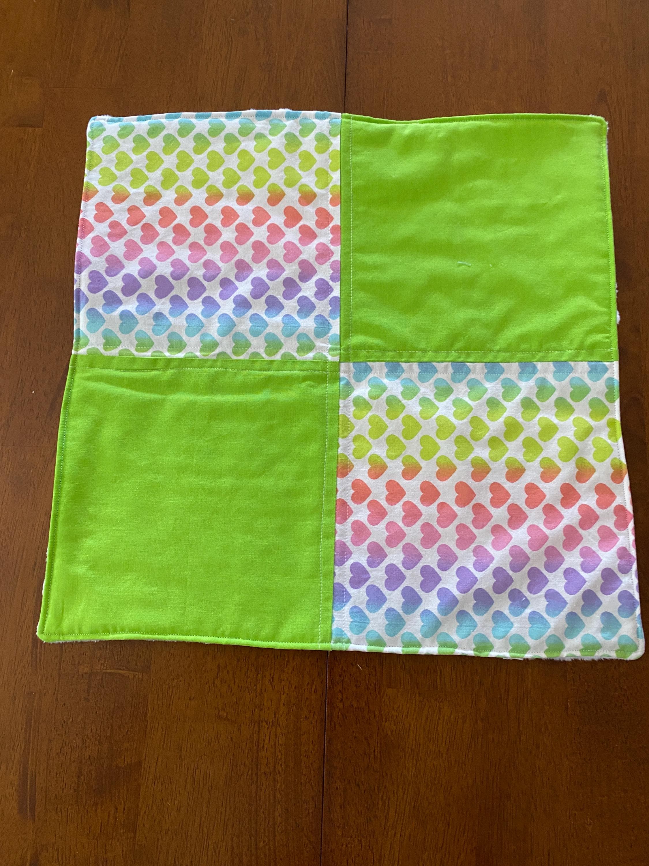 This cute approximate 16”x 16” Handmade Baby Doll Quilted Blanket with Colorful Hearts and Minky Back. The colors are Colorful Hearts and Green blocks. Back is soft white Minky dot fleece. A great young child's birthday gift. Warm Company batting, then quilted the three layers. Perfect for your child's play doll to snuggle with or playtime on the floor. Use, & Wash over & over! They get softer with every wash!