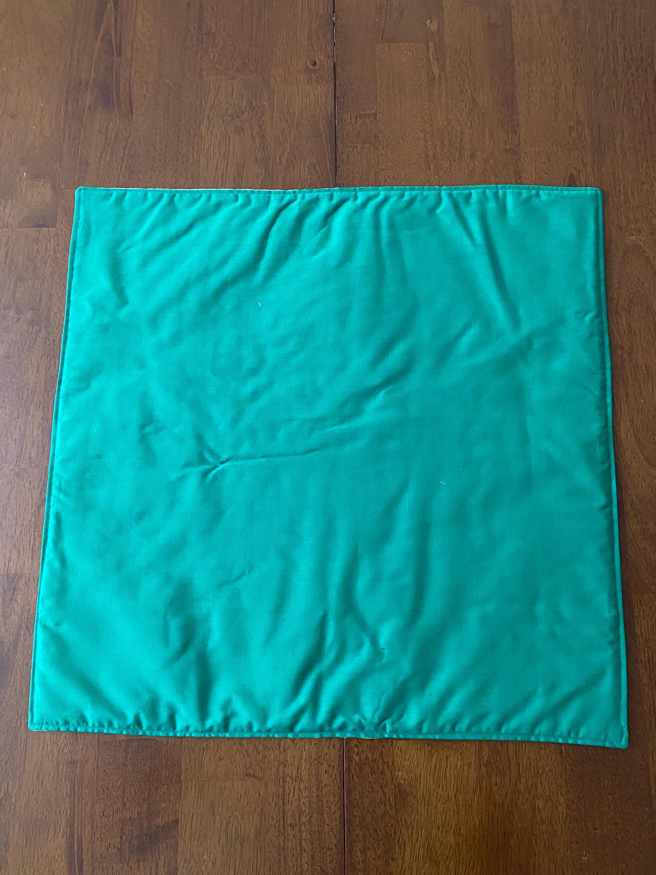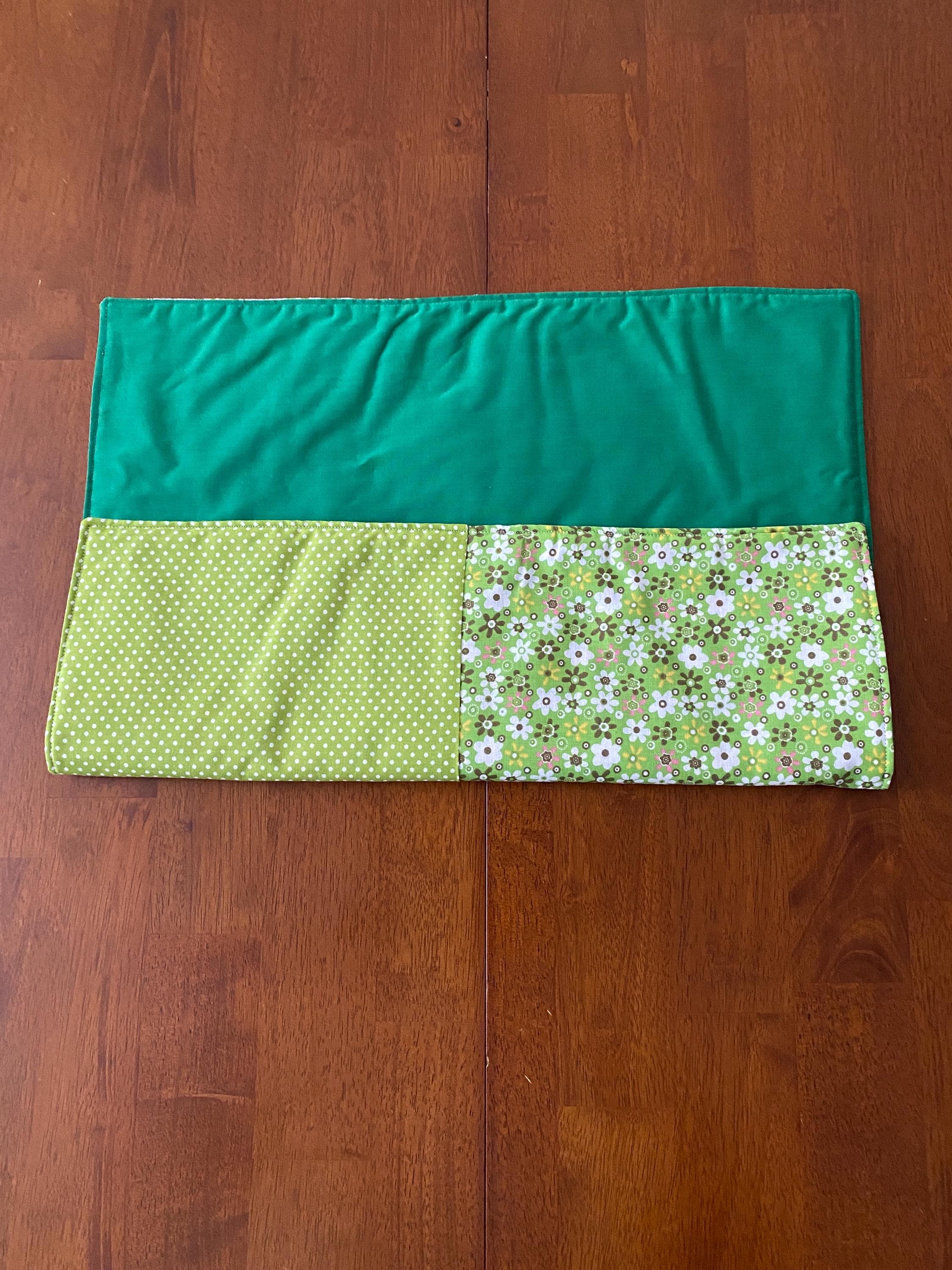 This cute approximate 16”x 16” Handmade Baby Doll Quilted Blanket with Polka Dots and Flower Blocks Green. Back is solid green material. A great young child's birthday gift. Warm Company batting, then quilted the three layers. Perfect for your child's play doll to snuggle with or playtime on the floor. Use, & Wash over & over! They get softer with every wash!
