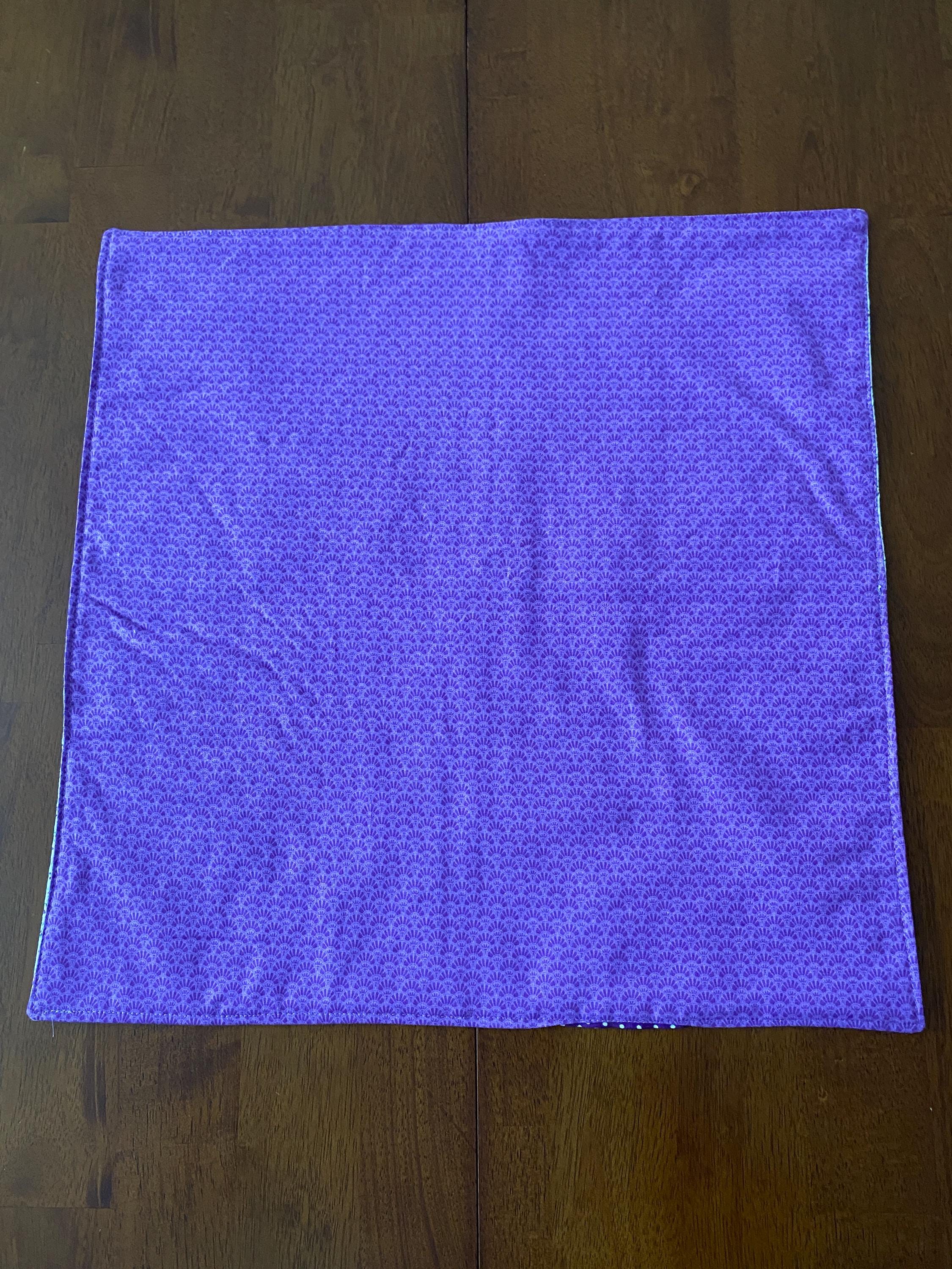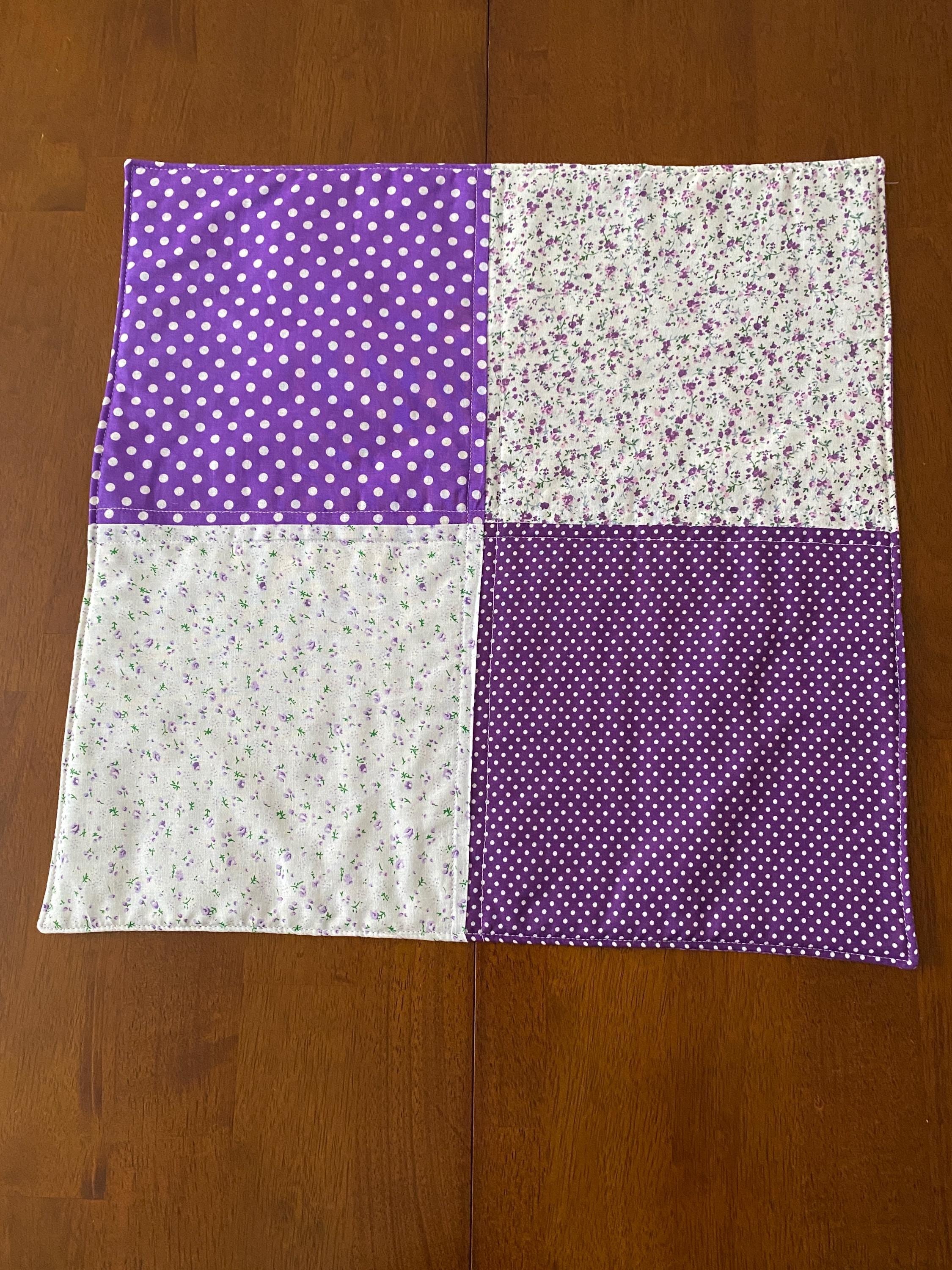 This cute approximate 16”x 16” Handmade Baby Doll Quilted Blanket with Polka Dots and Flower Blocks Purple. Back is solid purple material. A great young child's birthday gift. Warm Company batting, then quilted the three layers. Perfect for your child's play doll to snuggle with or playtime on the floor. Use, & Wash over & over! They get softer with every wash!