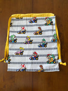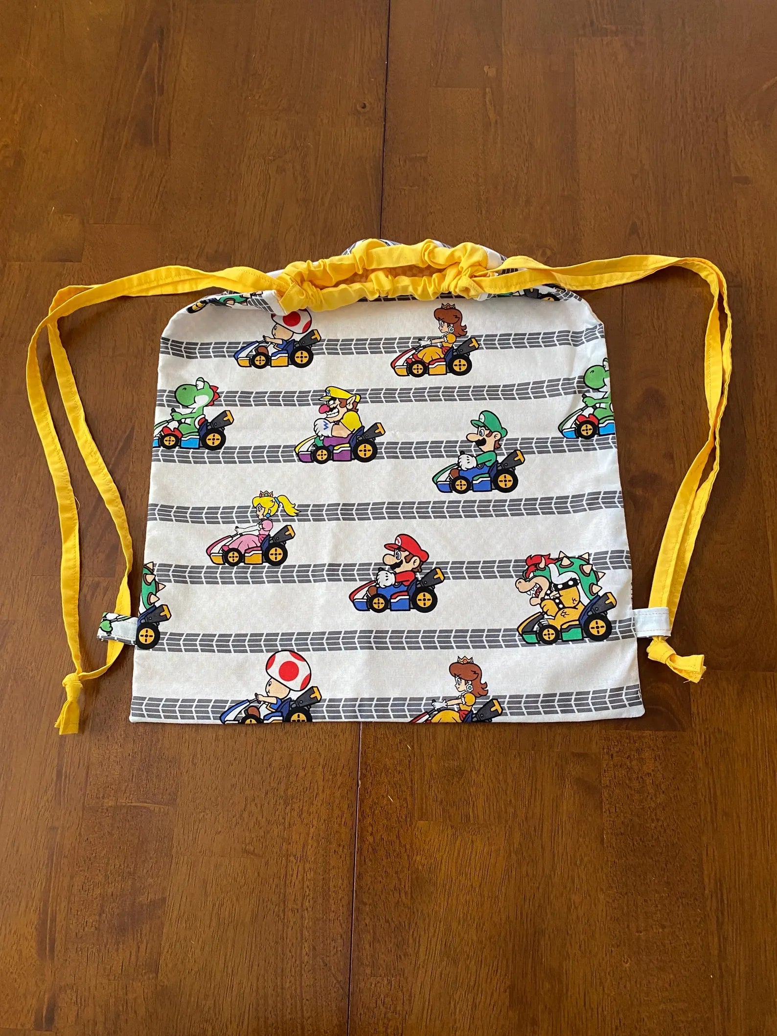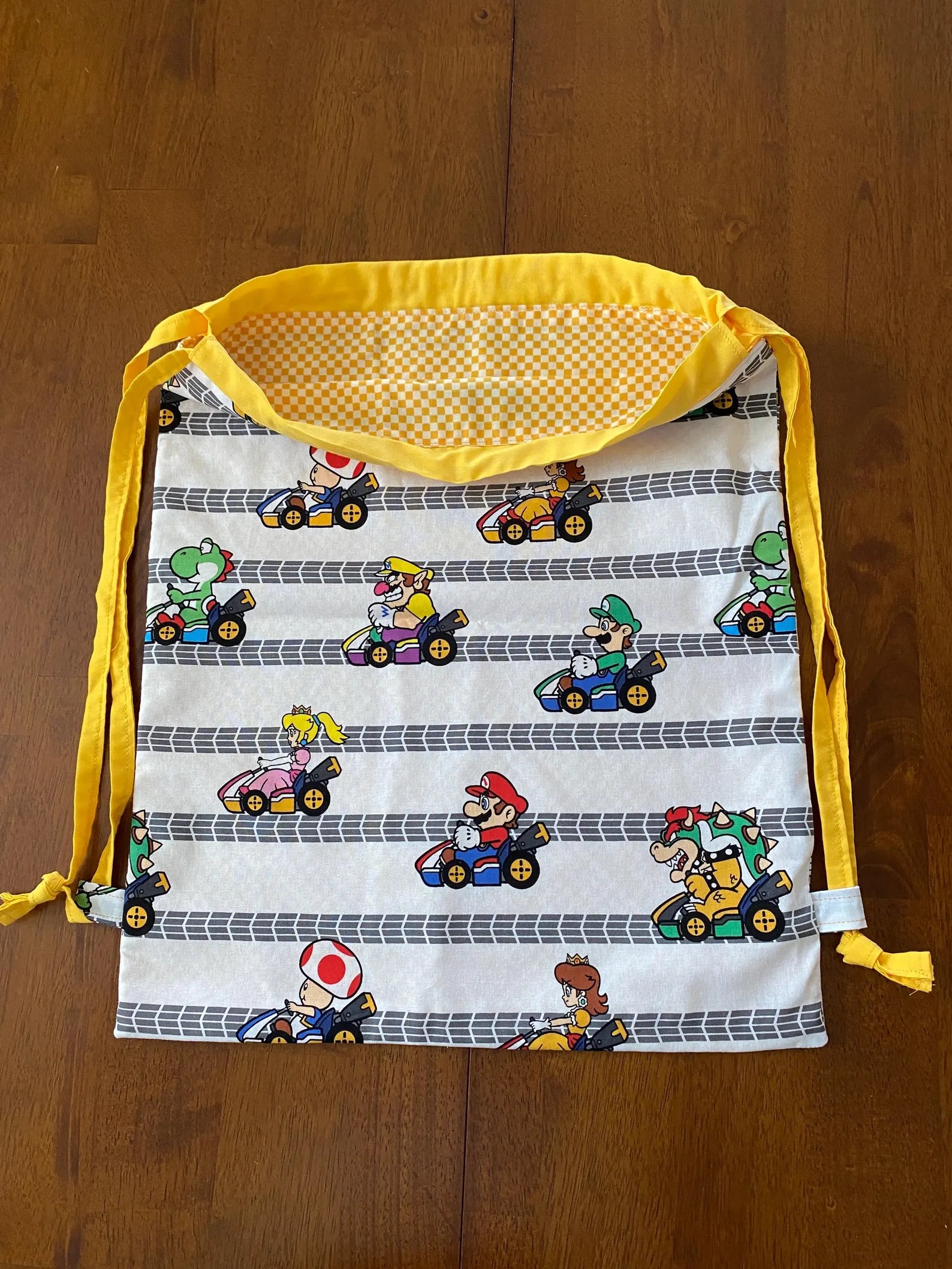 Handmade Lined Child Mario Bros Backpack With Draw Straps Orange Check Lining 16" x 14".