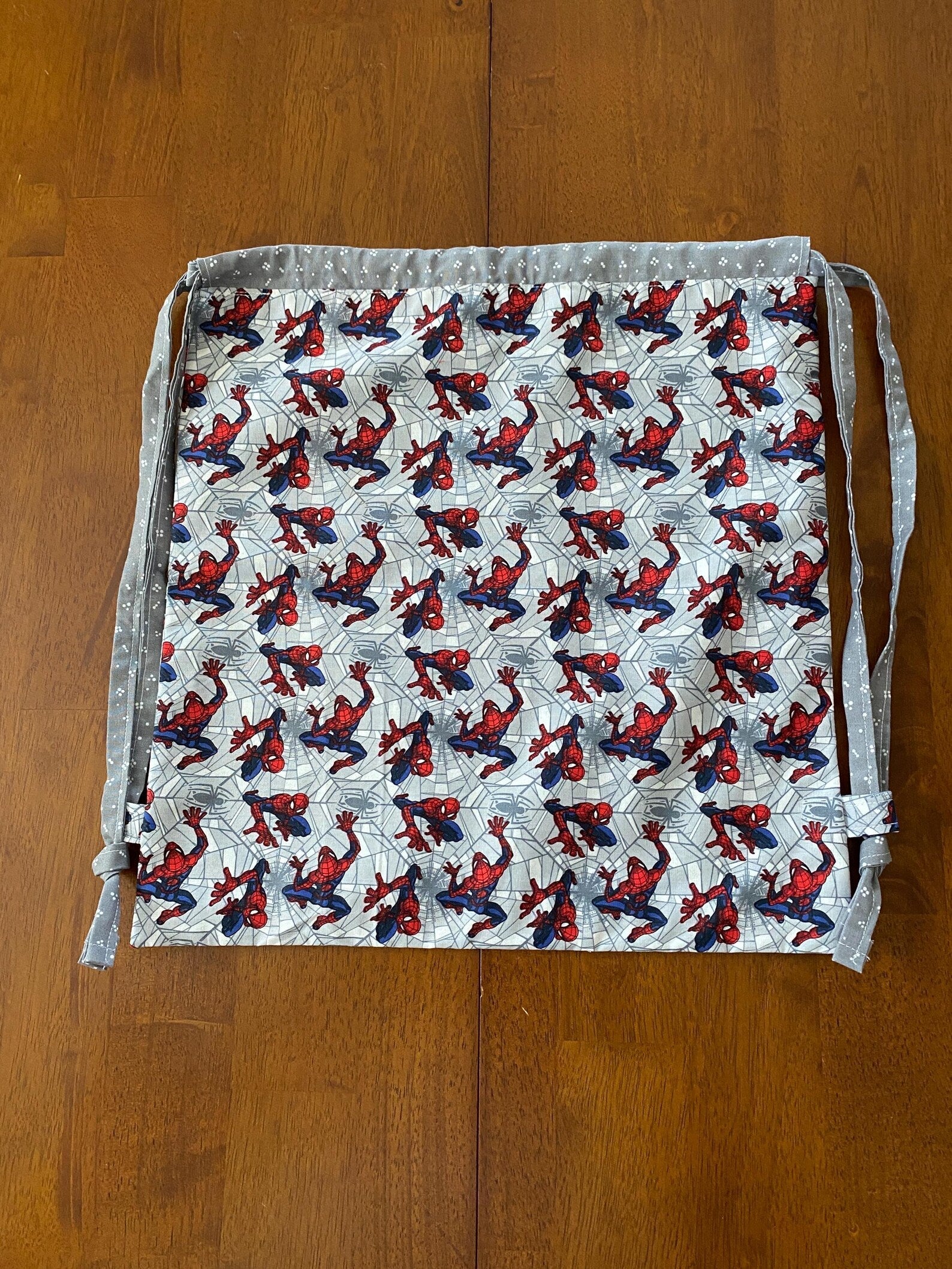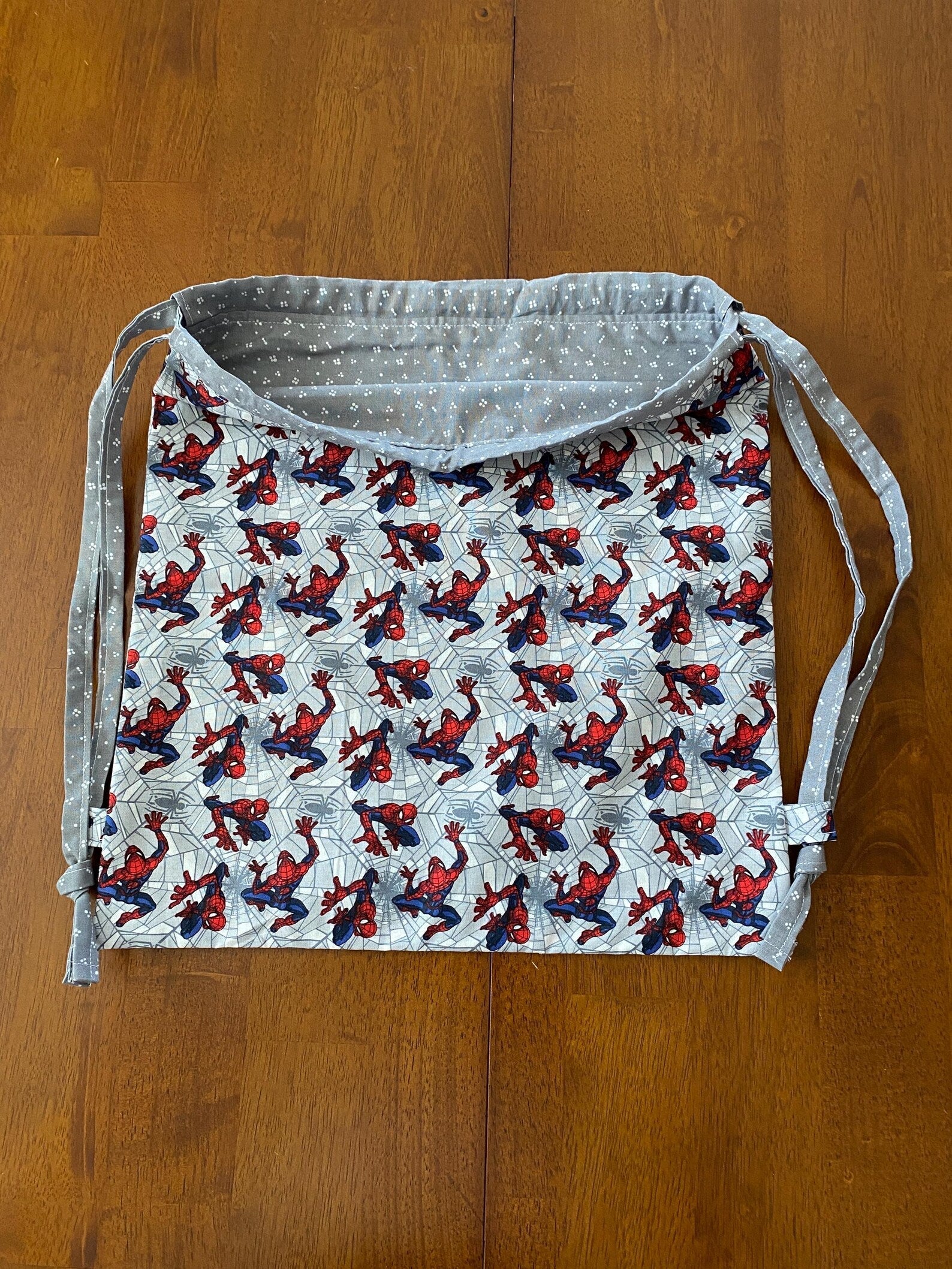 Handmade Lined Child Spiderman Backpack With Draw Straps Grey Lining 14" x 14".