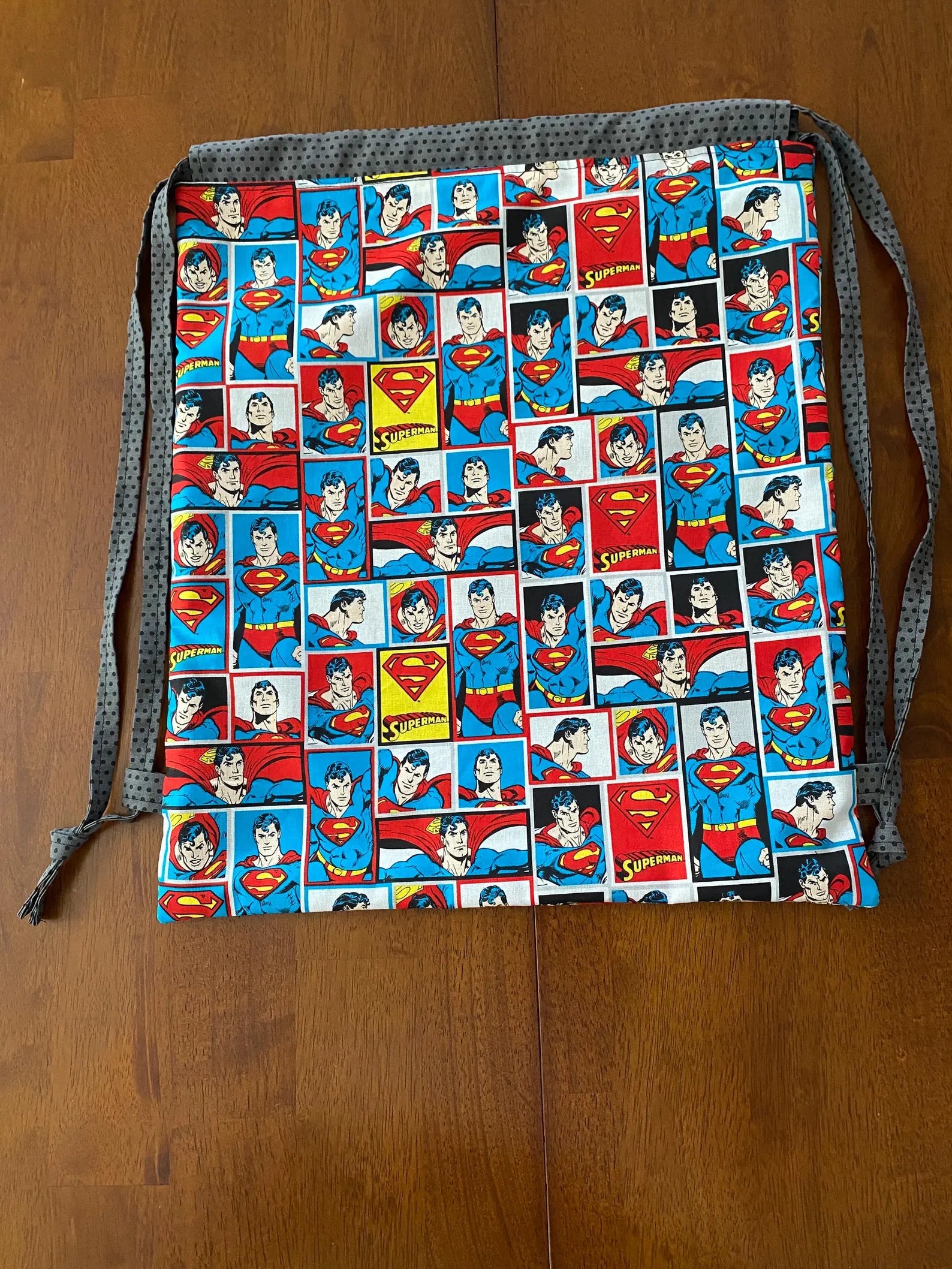 Handmade Lined Child Superman Backpack With Draw Straps Grey Polka Dot Lining