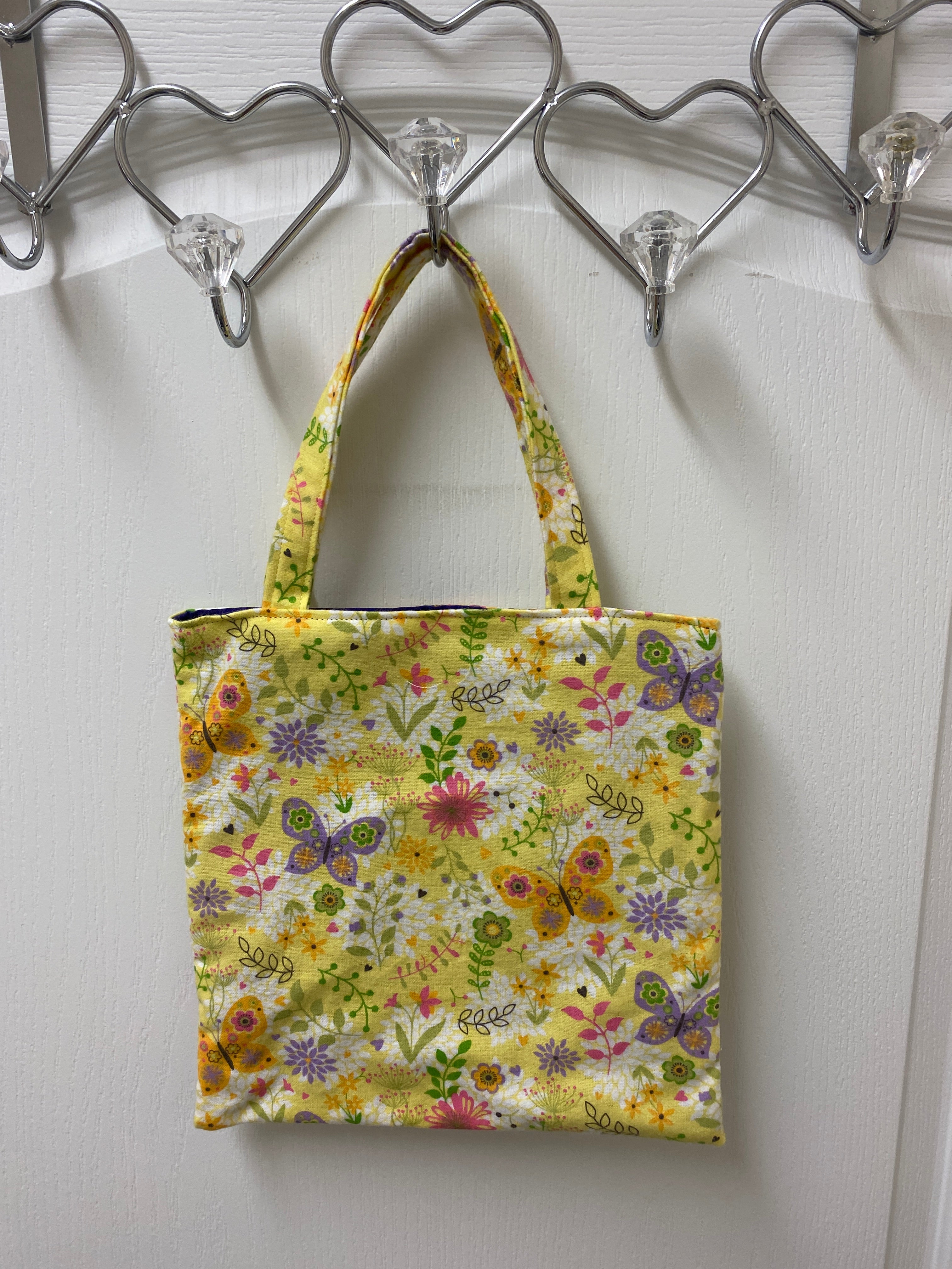 Handmade Flannel Lined Child Flowers and Butterflies Reversible Tote Bag Purple Lining