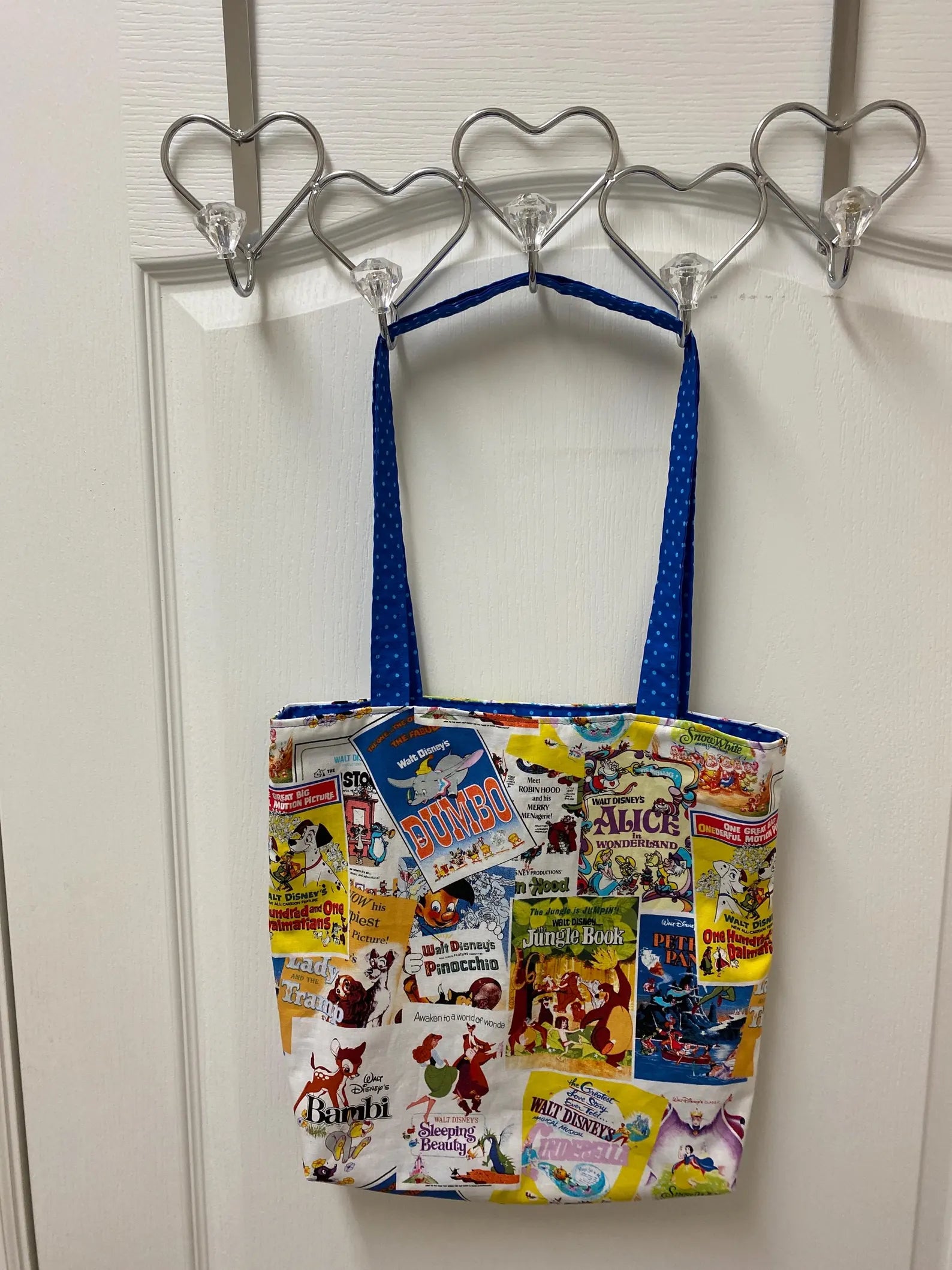 This handmade reversible large tote bag with Disney Movies Collection with a Blue Polka Dot lining and are perfect to carry around all your favorite things!