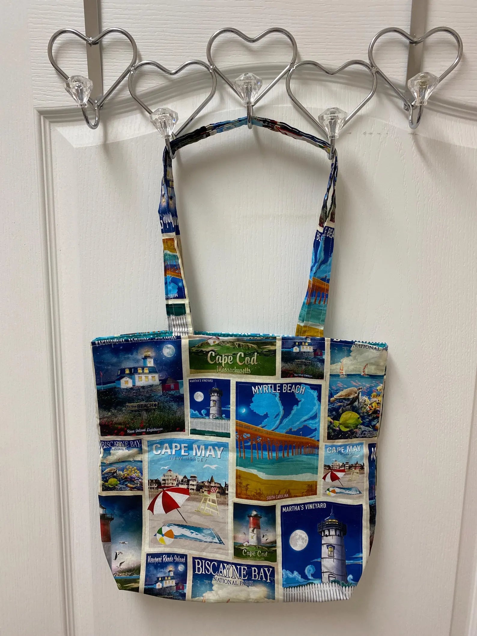 This handmade reversible large tote bag with Lighthouses with a Green and White Polka Dots lining and are perfect to carry around all your favorite things!