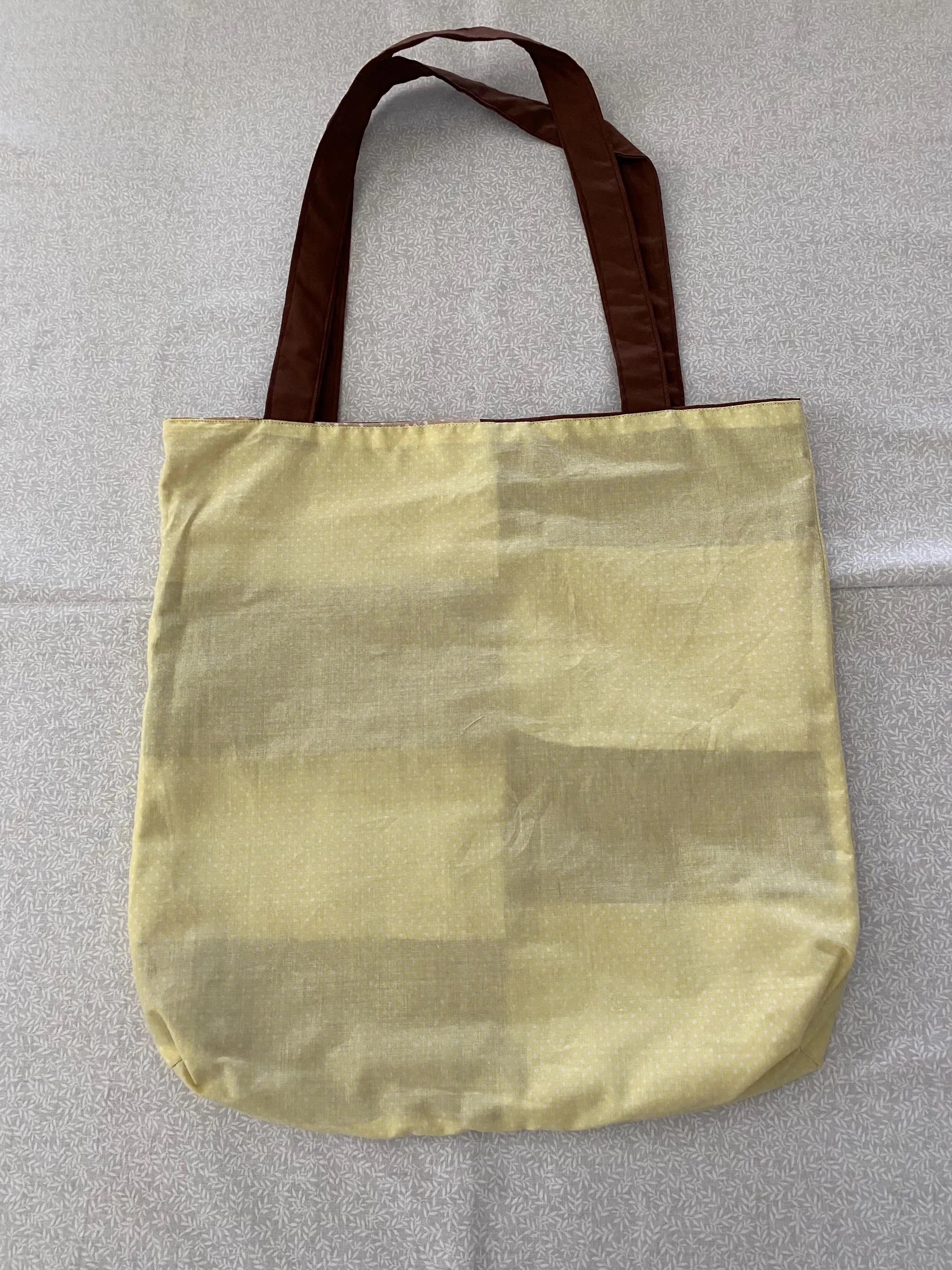 This handmade reversible large tote bag with Brown blocks and Beige blocks with Polka Dots with Yellow lining and are perfect to carry around all your favorite things!
