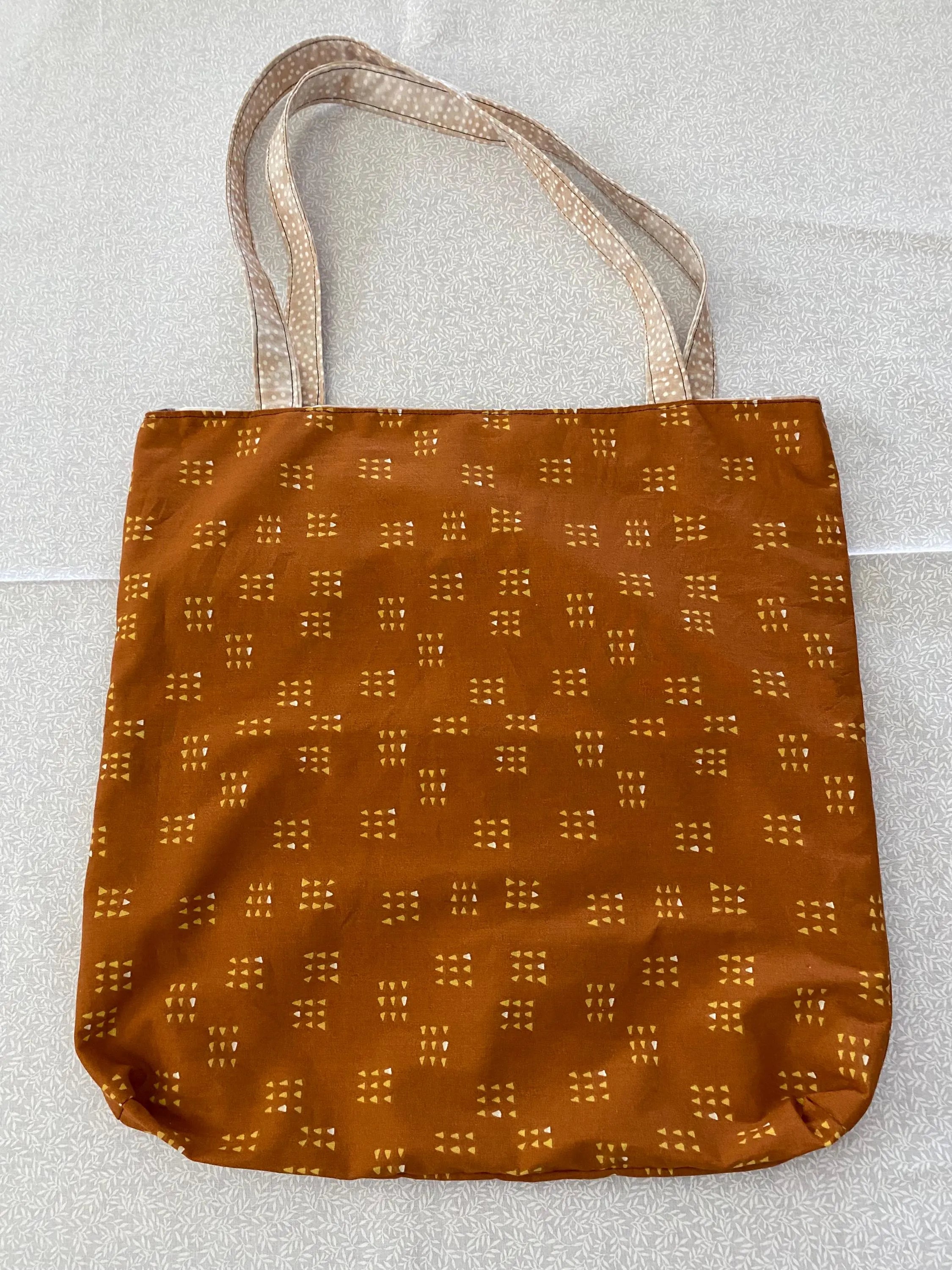 Each tote is made with 100% cotton fabric, lined with a coordinating fabric. Size is approximately 16 inches x 16 inches, with a 3-inch box bottom. Handles are 22" which gives them a 9-inch drop.