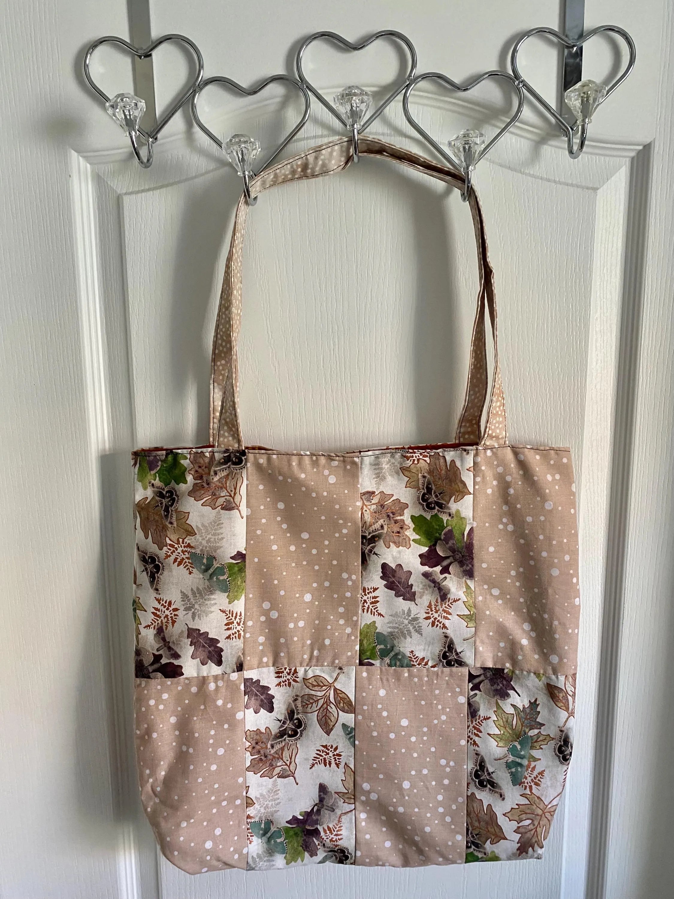 This handmade reversible large tote bag with Falling Leaves and Polka Dots with a Brown design lining and are perfect to carry around all your favorite things!