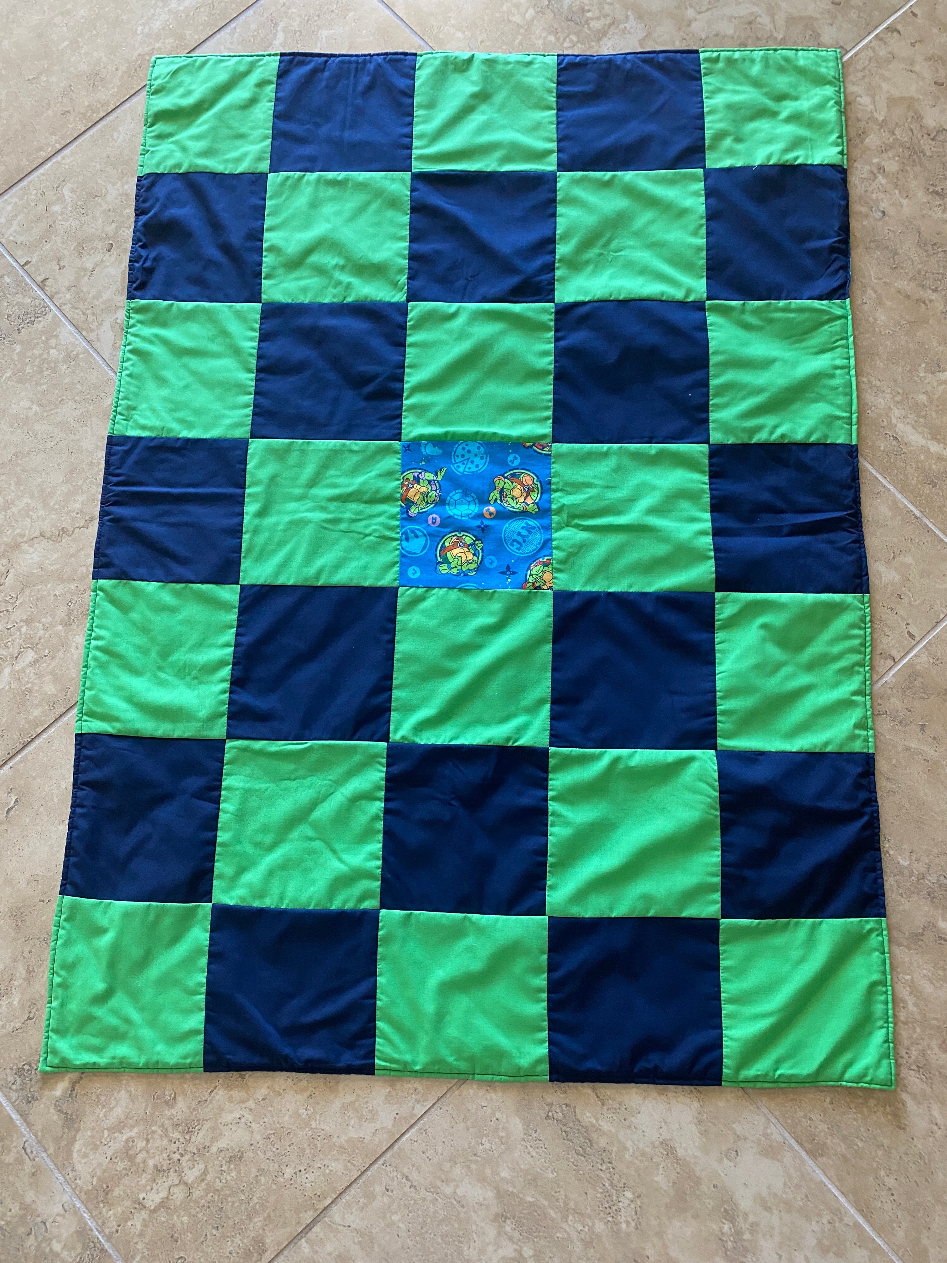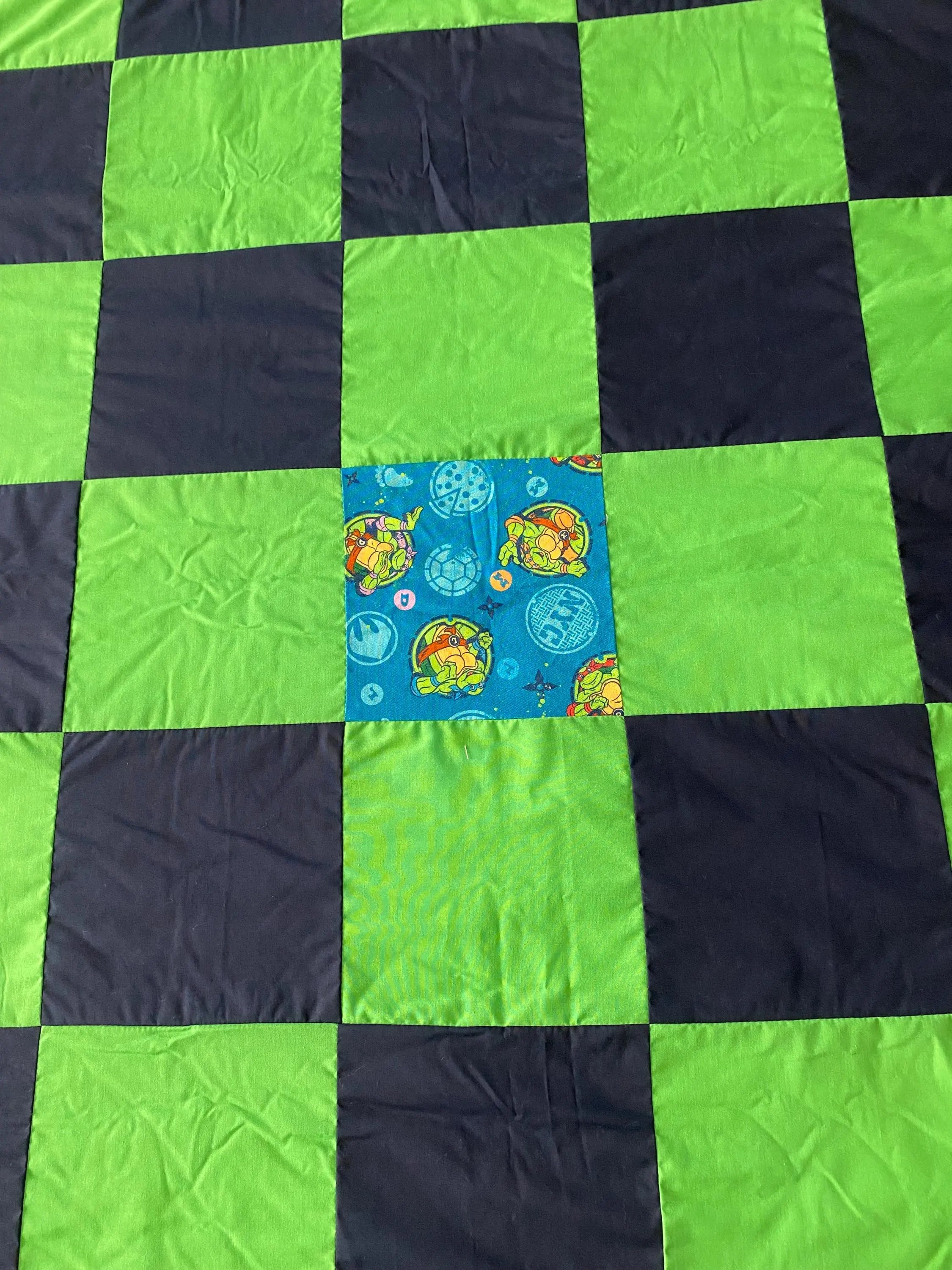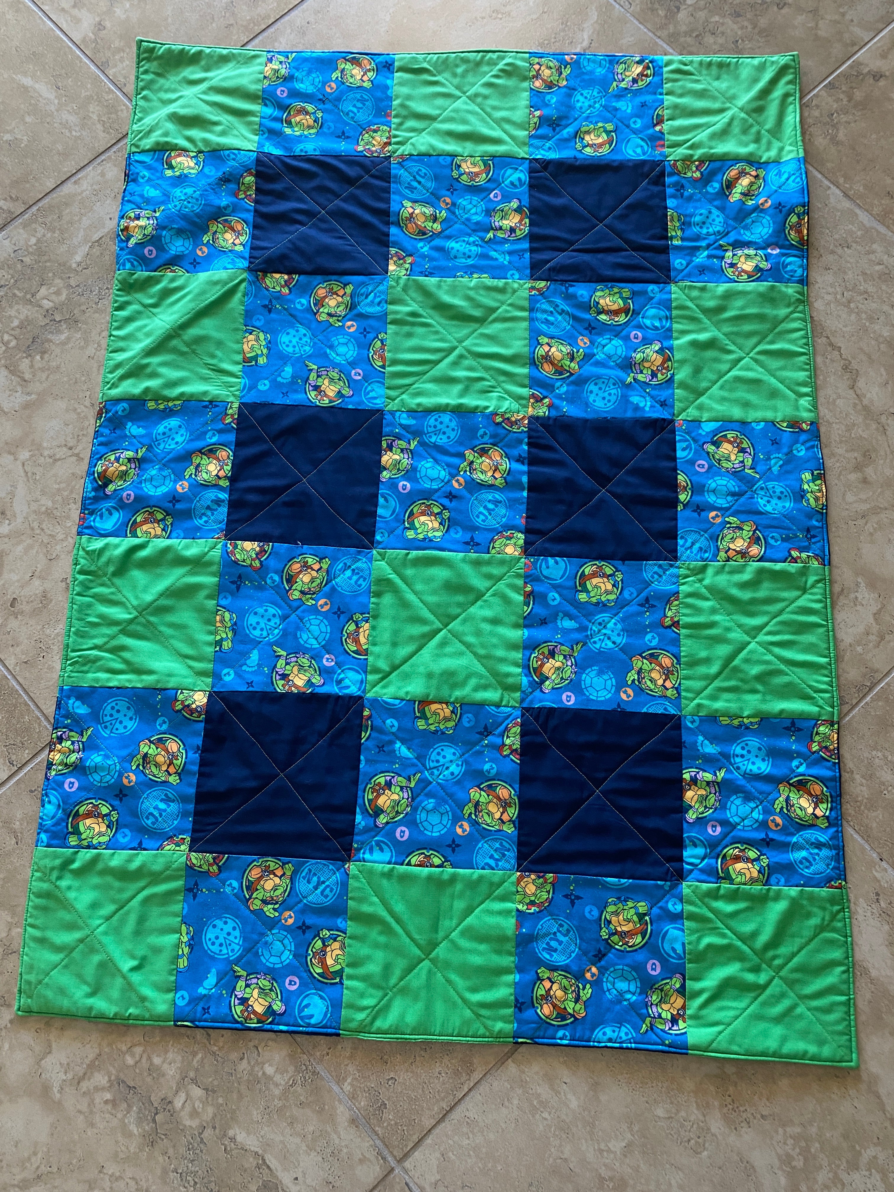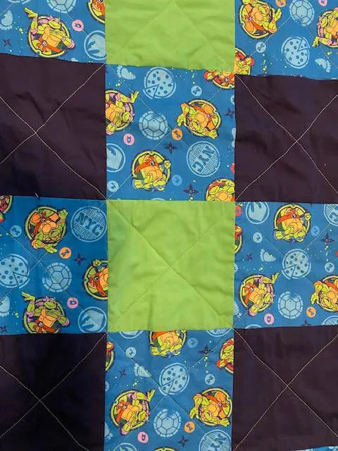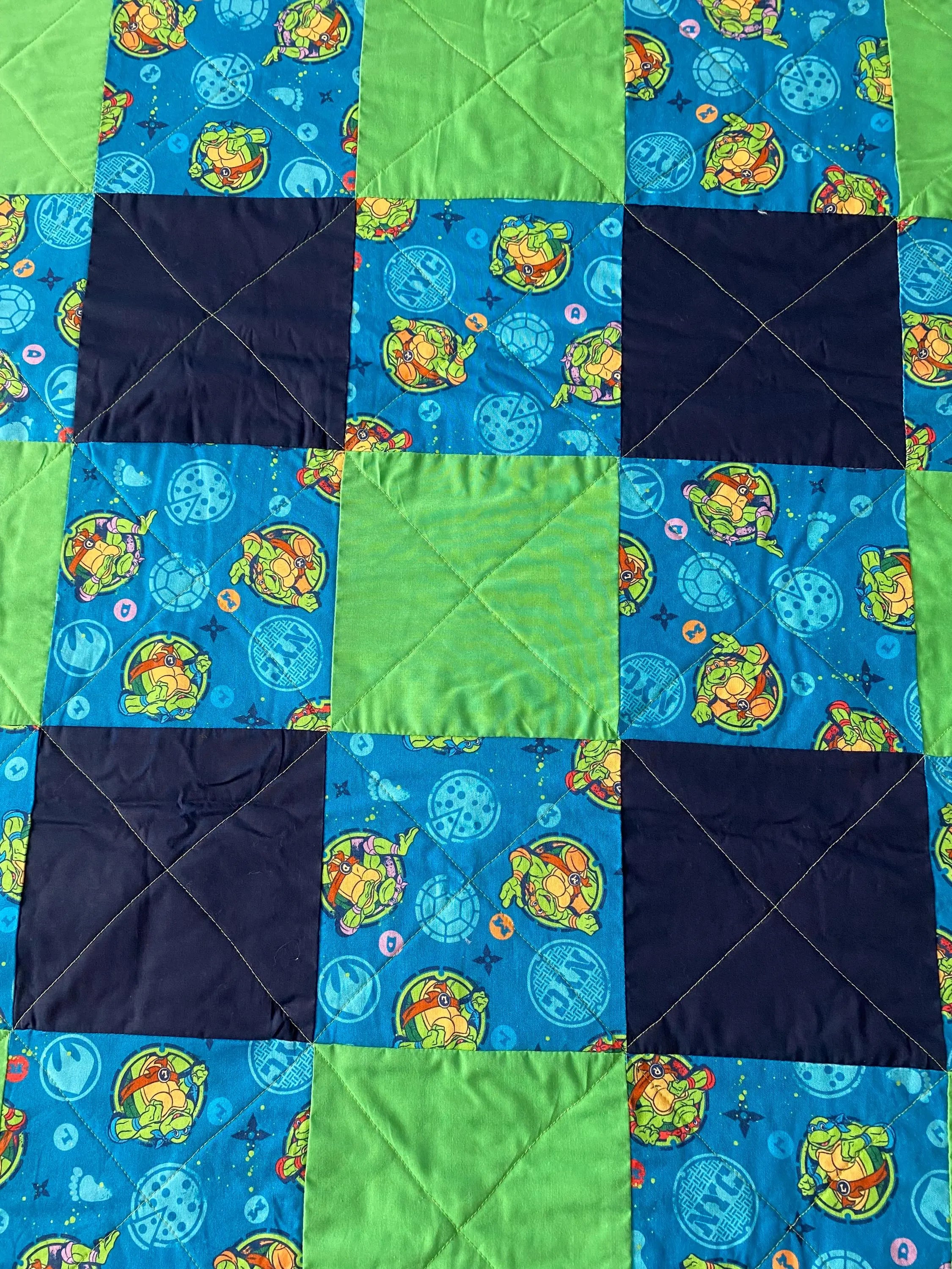 This cute 30x42 handmade Toddler Ninja Turtles quilt. A great birthday gift. Warm Company batting, then quilted the three layers.