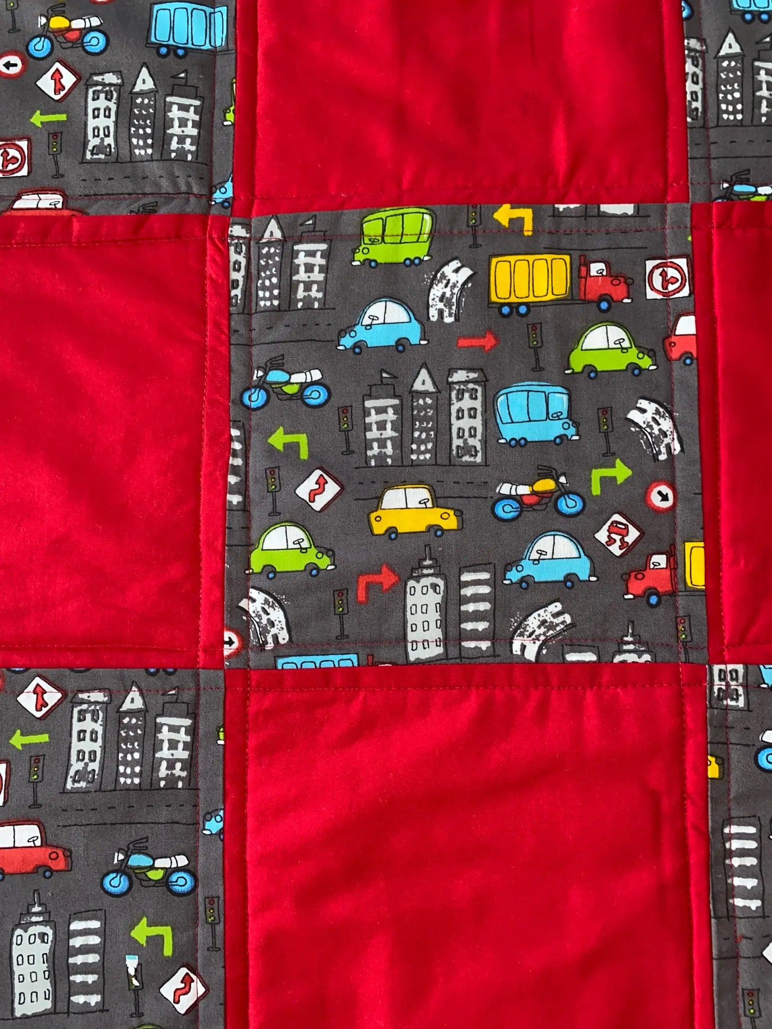 This cute 29”x 29” handmade Toddler Cars and Trucks quilt. A great birthday gift. Warm Company batting, then quilted the three layers. Reverse side is Blue.